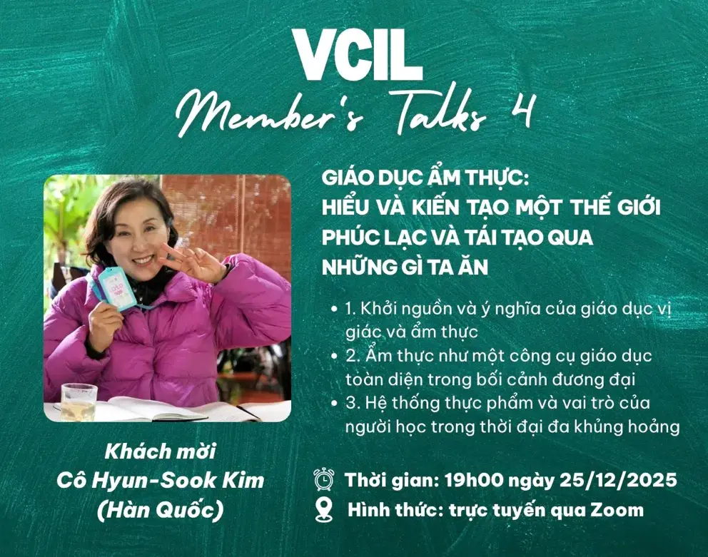 Vcil Members’ Talks là chuỗi sự kiện hàng tháng mở cho công chúng, nơi những câu chuyện, sáng kiến và mô hình tái tạo từ hệ sinh thái từ hội viên cộng đồng Vcil được lan tỏa. Vcil Members’ Talks không chỉ là nơi để lắng nghe, mà còn là không gian để cùng học hỏi, mở rộng mạng lưới, và nuôi dưỡng tinh thần hợp tác vì một tương lai tái tạo.
