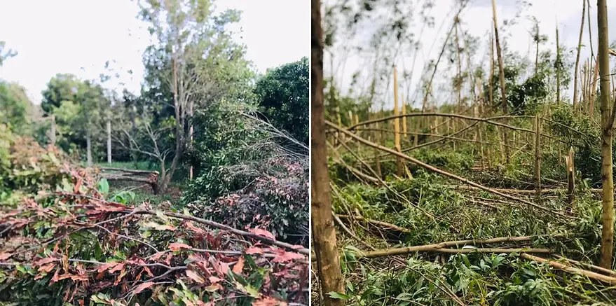 Chị Yến chia sẻ từ quan sát thực tế sau bão: các vườn keo trồng độc canh thường bị gãy đổ gần như hoàn toàn và gây sạt lở đất nghiêm trọng, trong khi những khu vườn có đa dạng sinh học, nhiều tầng cây và hệ rễ đan xen lại chịu thiệt hại ít hơn rõ rệt.