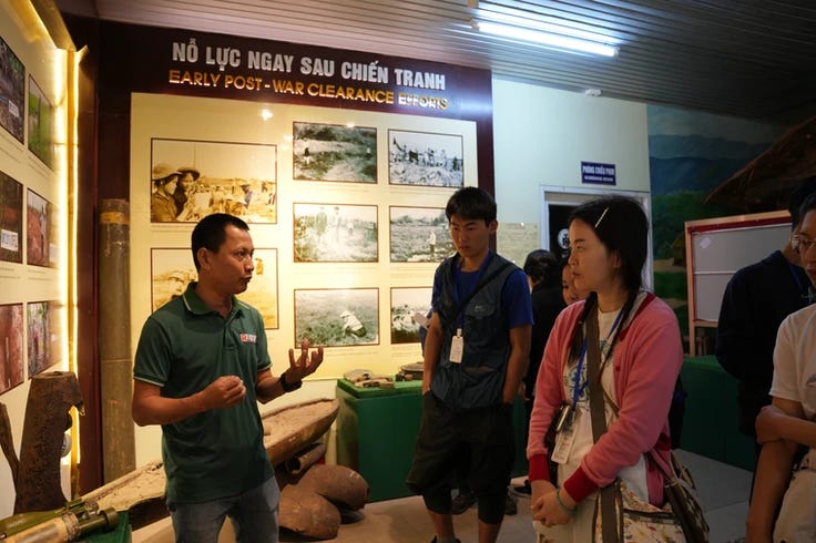 Một điểm dừng chân khác của chương trình đó chính là Trung tâm Trưng bày hoạt động khắc phục hậu quả bom mìn - Mine Action Visitor Center (được quản lí bởi Dự án RENEW). Tại đây, chúng mình được anh Phú, một trong những người làm việc tại trung tâm chia sẻ về hoạt động của Mine Action Visitor Center, và những vấn đề Quảng Trị phải đối mặt để giải quyết hậu quả chiến tranh. Một trong những nhiệm vụ chính của Mine Action Visitor Center đó là quản lý cơ sở dữ liệu hoạt động bom mìn, giáo dục người dân cách phòng tránh bom mìn và hỗ trợ rà phá bom mìn ở Quảng Trị, giúp đảm bảo sức khoẻ và sự an toàn của người dân.