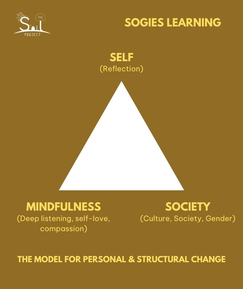 Chúng tôi tin rằng để tạo ra tác động có ý nghĩa trên thế giới và trở thành con người mà chúng ta muốn trở thành, chúng ta phải bắt đầu bằng cách kết nối với con người thật của mình và đồng thời hiểu được xã hội mà chúng ta đang sống – cách xã hội vận hành, thách thức và sự phức tạp của xã hội. Bằng cách kết hợp sự tự nhận thức này với chánh niệm, chúng ta có khả năng đưa ra quyết định sáng suốt về hành động của mình trong cuộc đời. Một trong những cách để kết nối lại với bản thân của chúng ta là hiểu sâu hơn về bình đẳng giới thông qua học tập về SOGIES.