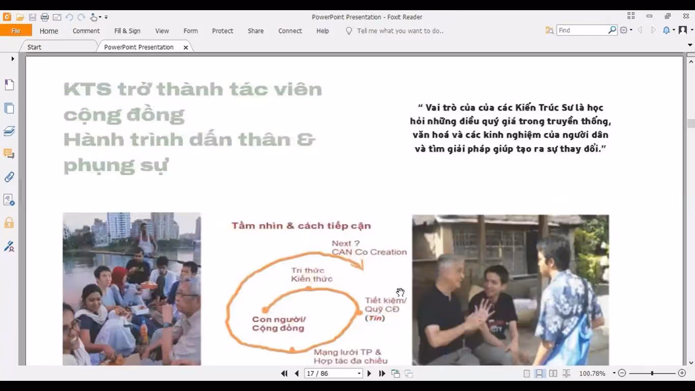 Từ trăn trở ấy, khái niệm “kiến trúc sư cộng đồng” được cô nhấn mạnh như một vai trò cần được nhìn nhận lại. Theo cô, “Kiến trúc sư cộng đồng” không đứng ở vị trí “người vẽ ra giải pháp”, mà là người mở ra bản đồ – nơi người dân có thể cùng tham gia, cùng hình dung và cùng quyết định tương lai của không gian mình gắn bó. Đó là quá trình làm việc dựa trên đối thoại, kiên nhẫn và sự tôn trọng tri thức bản địa, thay vì áp đặt những mô hình có sẵn.