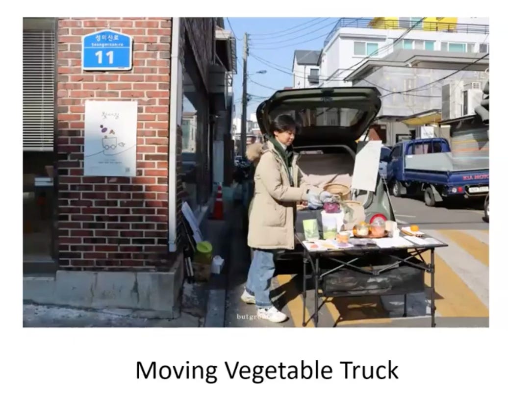 Sau đó, nhóm thử mô hình “moving vegetable truck” - một chiếc xe rau lưu động theo hướng zero-waste, nơi nhóm mang thực phẩm trên chiếc xe lưu động đến nhiều điểm khác nhau trong thành phố để bán, đồng thời người mua cũng có thể đặt hàng trước. Thời điểm diễn ra thử nghiệm là vào mùa đông, và dù không ít người dừng lại hỏi thăm, phần lớn mọi người không mua hàng.