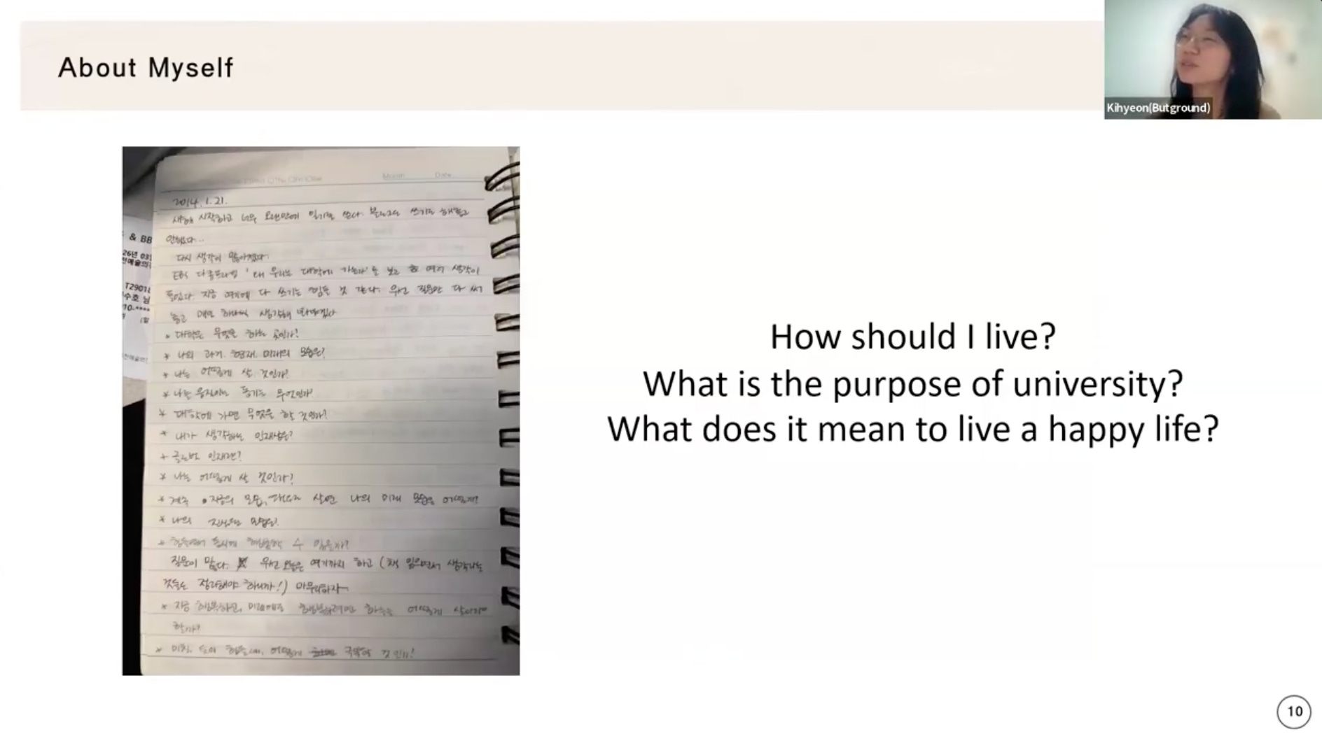 Từ những năm trung học, Kihyeon đã có thói quen viết nhật ký. Những cuốn sổ do đó như người bạn chứng kiến sự trưởng thành trong suy nghĩ của Kihyeon. Lật giở những trang nhật kí đó, Kihyeon đã đặt những câu hỏi hiện sinh như: