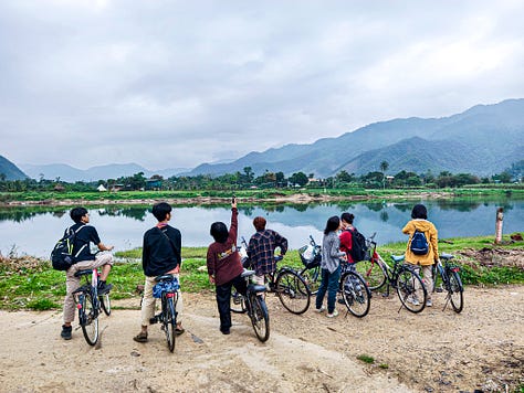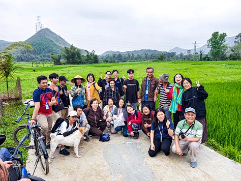 Chúng tôi chọn dịch vụ đạp xe do anh Hưởng quản lý, dùng những bữa ăn lành mạnh, giàu dinh dưỡng do tổ ẩm thực địa phương chuẩn bị. Mỗi ngày, hành trình của chúng tôi không chỉ dừng lại ở việc di chuyển hay thưởng thức ẩm thực, mà còn là những trải nghiệm học tập gắn liền với từng con người, từng mảnh đất mà chúng tôi đặt chân đến. Chúng tôi ăn sáng tại nhà một thành viên HTX, tham quan và tìm hiểu các mô hình sản xuất do những người dân vận hành, cùng nhau trò chuyện để hiểu hơn về cuộc sống của họ. Nhờ vậy, dịch vụ không chỉ tập trung vào một điểm, mà được chia đều cho nhiều người trong cộng đồng, tạo nên một mạng lưới sinh kế bền vững, nơi mỗi đoàn du khách đến không chỉ để trải nghiệm mà còn góp phần trực tiếp vào sự thịnh vượng chung.