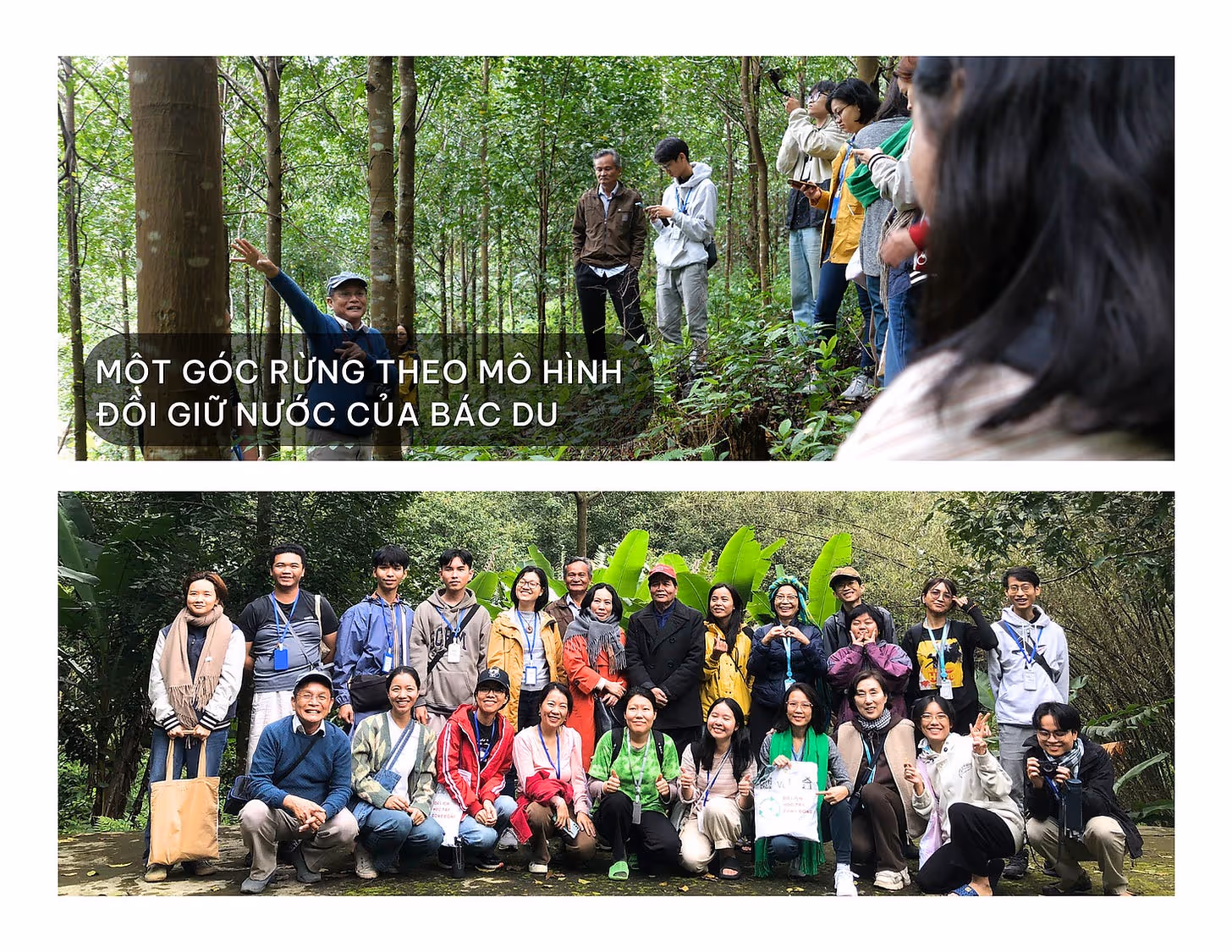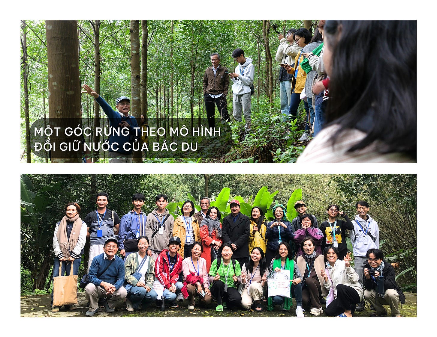 Chúng tôi đến thăm Bác Du, một người trước đây từng canh tác đơn loài, sau khi nhận thức được vấn đề của việc khai thác rừng quá mức, chỉ lo kinh tế trước mắt, bác đã ngay lập tức chuyển hướng sang mô hình “Đồi giữ nước” (được phát triển bởi HTX Hòa Bắc) để giữ đất, giữ rừng.