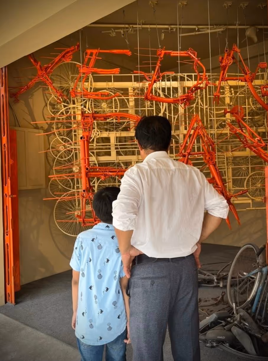 Và rồi, có một nơi anh định ghé ngắn ngày nhưng đã “giữ chân” anh hơn 2 năm - Xưởng Tái Sinh tại Hội An của anh ‘Rác sĩ’ Dân. Ở đó, Huy không chỉ học những kỹ thuật rất cụ thể như hàn điện, cắt ghép kim loại, đục khoan trên những khung xe đạp hỏng, xử lý từng mảnh phế liệu tưởng như vô dụng. Điều thay đổi anh sâu sắc hơn cả là cách nhìn về giá trị - giá trị của rác, phế liệu, của những thứ bỏ đi mà chúng ta thường coi là vô giá trị. Tại Xưởng, “rác” không phải là phần cuối của một vòng đời, mà là điểm bắt đầu của một vòng đời mới. Một khung xe gãy, một bánh răng rỉ sét, một thanh sắt cong vênh… đều có thể trở thành chất liệu cho một tác phẩm nghệ thuật, một cấu trúc mới, một hình hài khác. Từ đó, anh tin rằng tương lai sẽ không còn được xây bằng tài nguyên mới khai thác, mà “rác” sẽ là nguồn nguyên liệu của sáng tạo, dần trở thành ‘trào lưu tái sinh’. Từ trải nghiệm này, Huy mang nửa tấn khung xe đạp hỏng về Bến Tre và sáng lập Xe Đạp Bay - không gian trưng bày nghệ thuật tái sinh từ phế liệu xe đạp, đồng thời là cửa hàng xe đạp chất lượng cao.