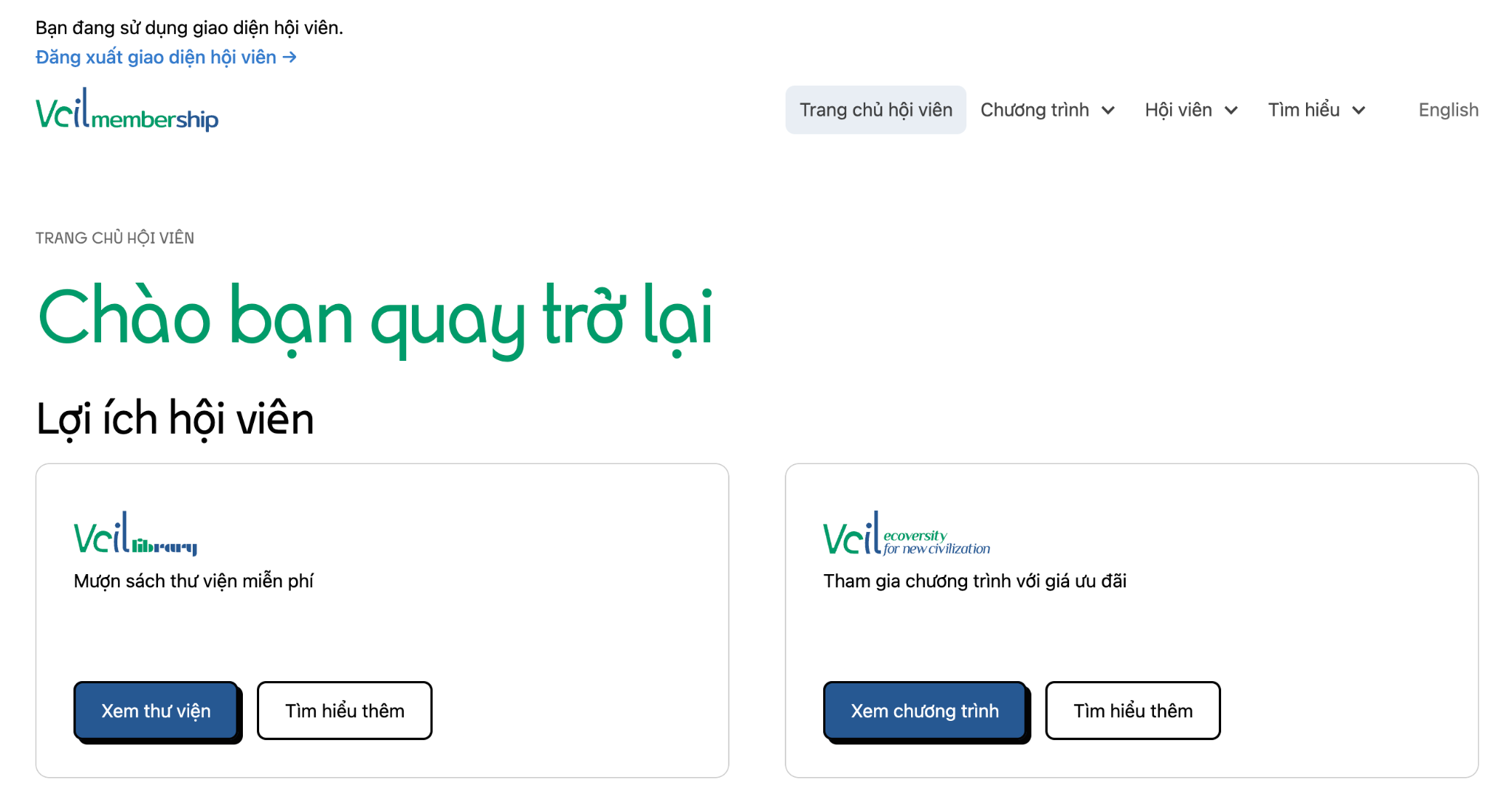 Bước 4: Anh/chị sẽ truy cập được vào giao diện Hội viên (vẫn đang trong quá trình phát triển). Có rất nhiều chức năng và nguồn lực khác chờ anh/chị khám phá và sử dụng.