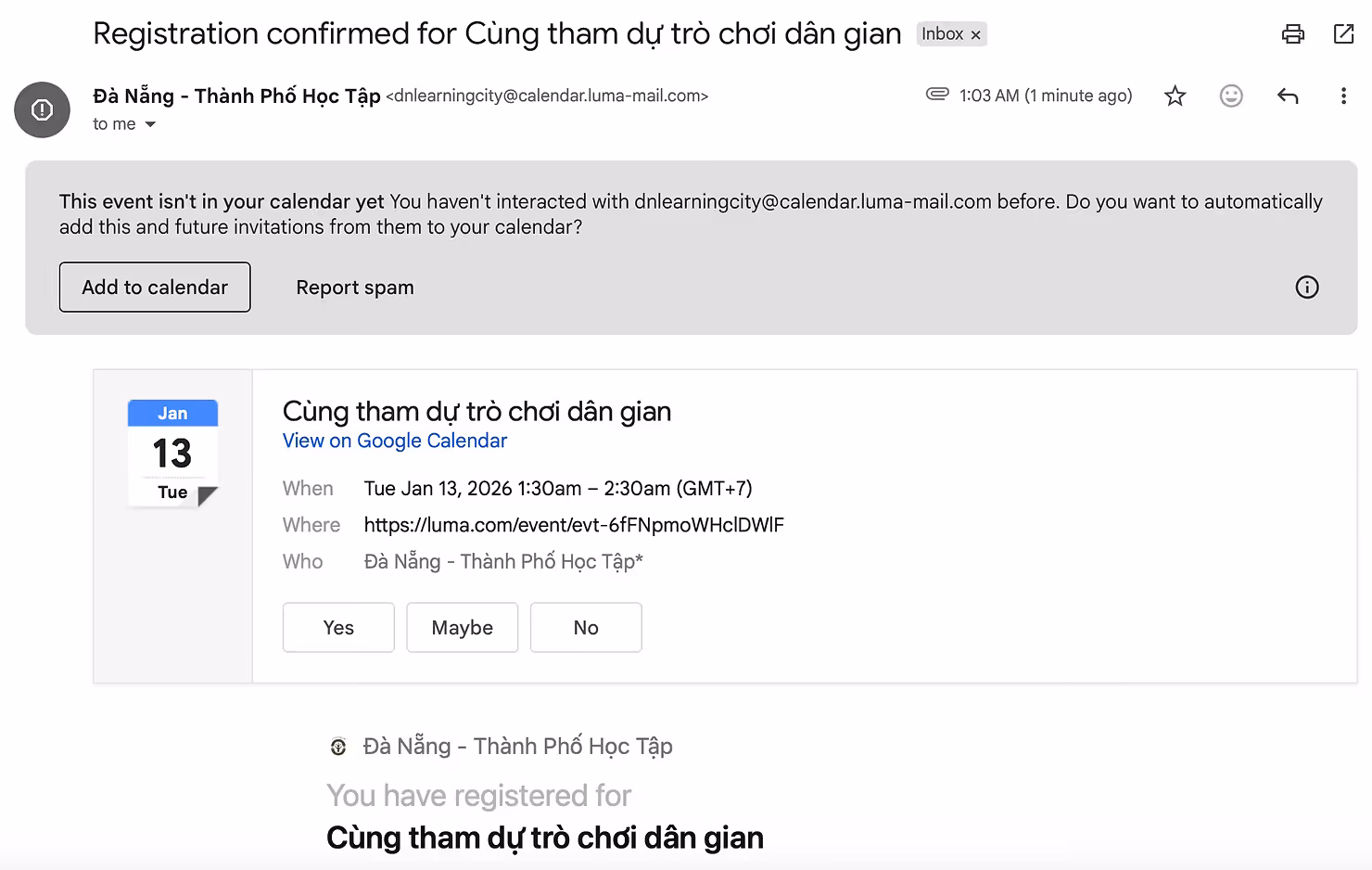 Cuối cùng, host có thể liên lạc với bạn, hoặc bạn cứ đợi để ngày sự kiện diễn ra và tham dự thôi! Sẽ có những email tự động nhắc nhở bạn về sự kiện nha!