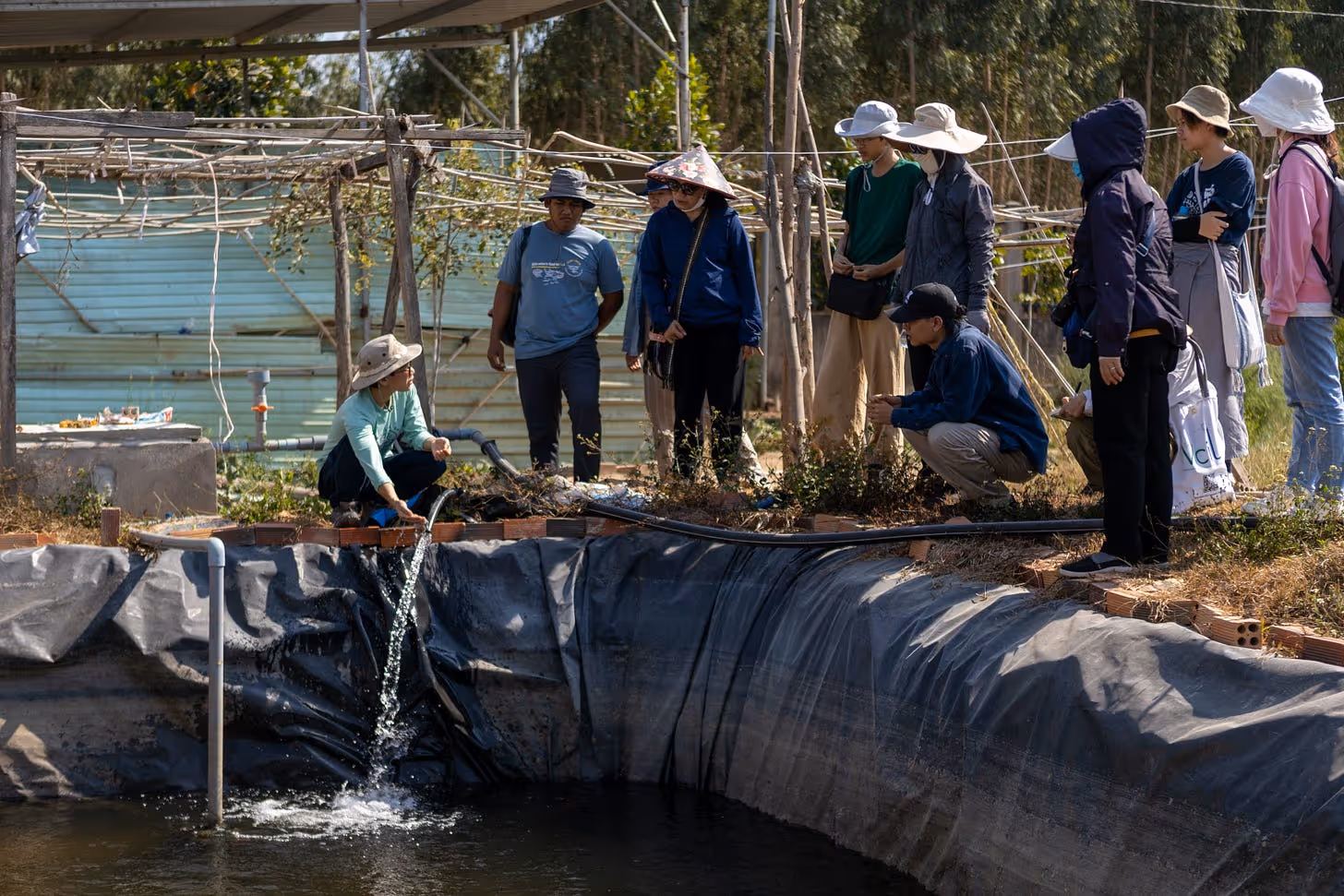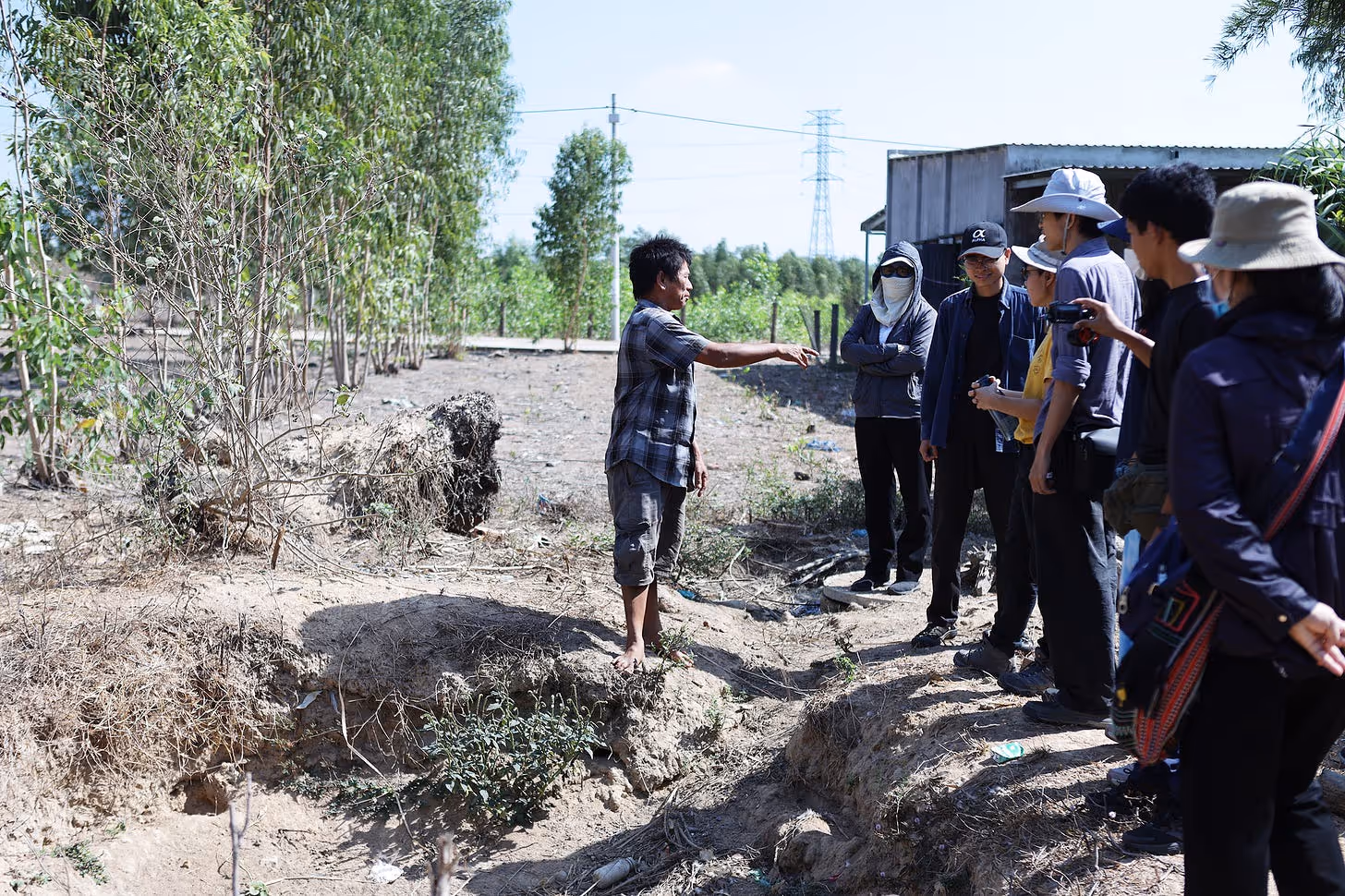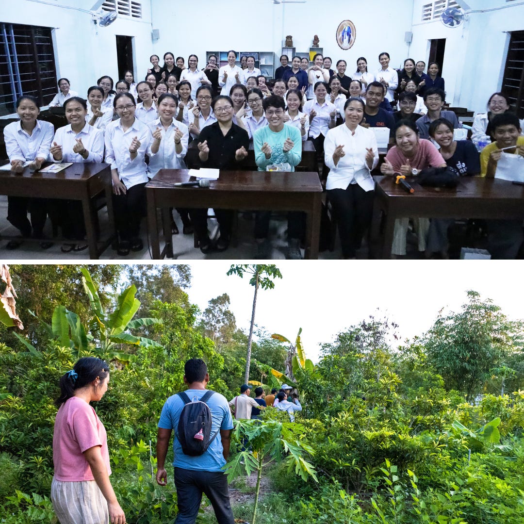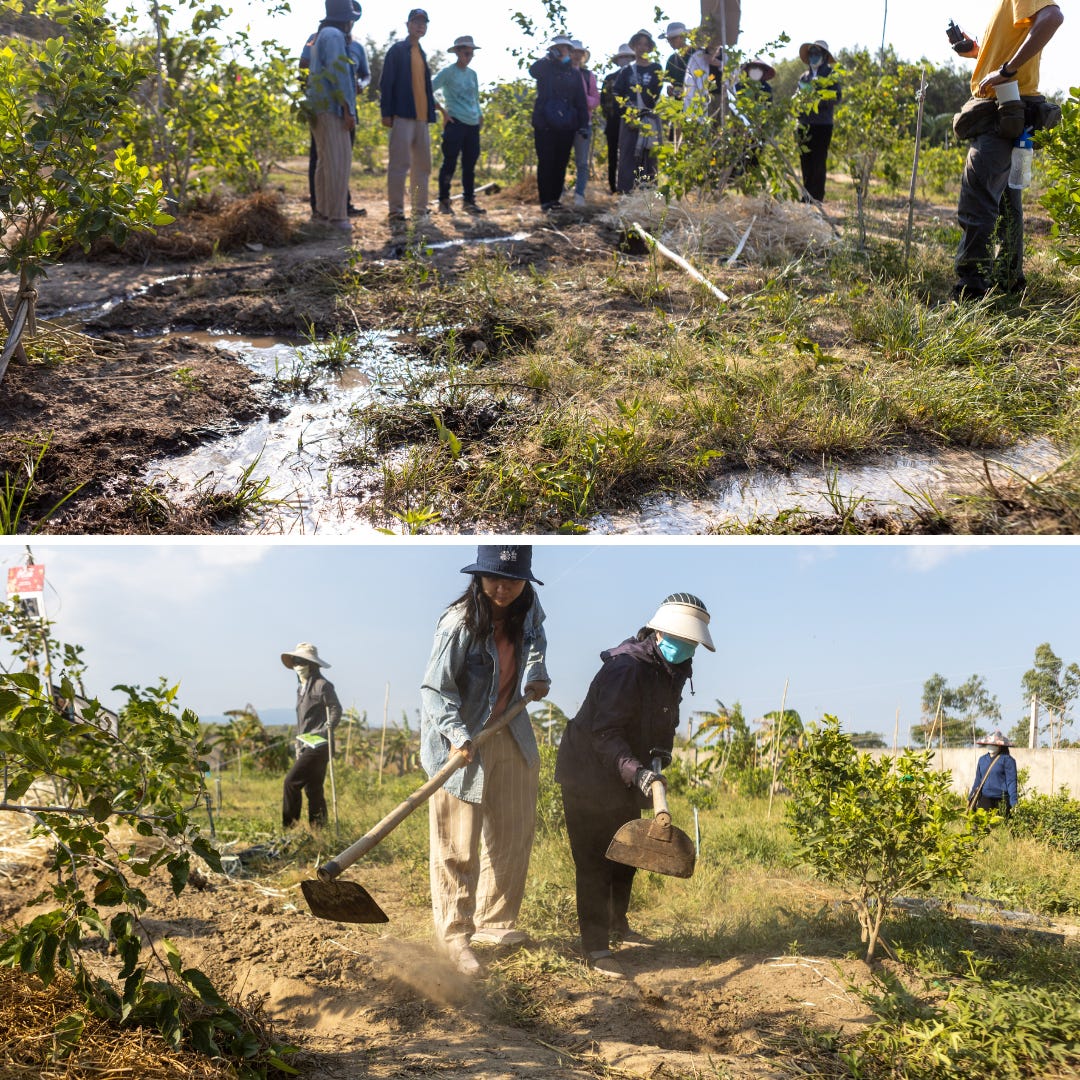 ⭐️ Các nguyên lý nông nghiệp tự nhiên đã được trình bày sống động tại nhiều ngữ cảnh sinh thái khác nhau. Điển hình đầu tiên là mảnh vườn của hội dòng MTG Phan Thiết. P Tang đặt câu hỏi về tác động của tấm bạt nilon phủ lên mặt ao và ống dẫn nước bằng nhựa. Nước sẽ chỉ bốc hơi lên không khí và không thể thẩm thấu vào lòng đất. Trong khi đó, cây cần hút độ ẩm trong đất để sinh trưởng và phát triển thông qua bộ rễ của chúng. Ông bà chúng ta đã phát triển một loại công nghệ đơn giản nhưng có thể cấp ẩm cho toàn bộ khu vườn rất hiệu quả, đó chính là các con kênh mương. Nhóm Thái Lan đã hướng dẫn mọi người cách đào các con kênh vừa để lưu trữ các giọt nước cho khu vườn vừa phân phối nước đến vị trí của những cây trồng cần thiết. Chúng ta có thể không thấy nước bằng mắt, nhưng nó được trữ ở dưới dạng độ ẩm trong đất.