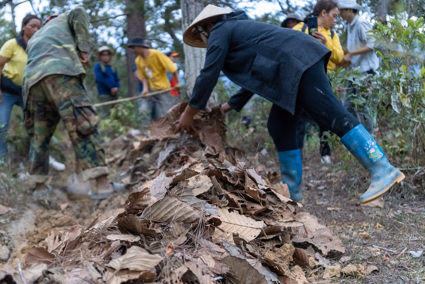 “Nuôi đất để đất nuôi cây" không chỉ dừng lại ở việc giữ nước, mà còn tạo môi trường cân bằng lành mạnh trong đất. Giống như con người cần đội mũ khi đi dưới trời nắng, đất cần được che phủ để ánh nắng mặt trời không tiêu huỷ các vi sinh vật trên lớp đất mặt. Dưỡng đất còn được thực hiện thông qua bón các loại phân ủ để cung cấp vi sinh vật tốt. Một điều thú vị mà cả đoàn học được là “không phải cứ bón phân càng nhiều sẽ càng tốt". P Tang và Boy chỉ ra rằng, phân gà vườn hiện tại dùng còn khá mới, và do bón nhiều sát gốc nên làm môi trường đất cực kỳ nóng. Nấm mốc đã xuất hiện và cây trồng bị dịch bệnh. Do đó, cần sử dụng loại phân bị phân huỷ nhiều hơn cũng như rải rác xung quanh lớp tấp ủ thay vì dồn vào gốc cây. Với những thử nghiệm trên, P Tang dặn mọi người hãy đợi quan sát kết quả rồi đối chiếu với cách làm cũ mà không cần tin tưởng ngay lập tức.