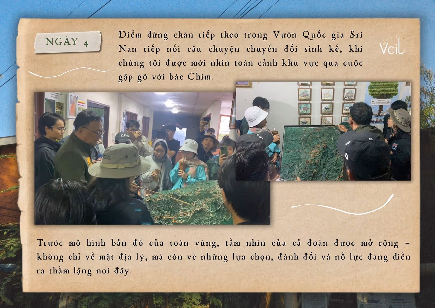 Câu chuyện chuyển đổi ấy được nhìn ở bình diện rộng hơn qua cuộc gặp gỡ với bác Chim, đại diện lực lượng kiểm lâm tại Sri Nan. Trước bản đồ toàn khu vực, chúng tôi hiểu rõ hơn những lựa chọn và đánh đổi mà đội ngũ kiểm lâm phải đối diện. Việc dừng canh tác vùng cao không phải là quyết định dễ dàng, bởi họ nhận thức rõ tác động trực tiếp đến đời sống người dân. Chính vì vậy, song song với bảo tồn rừng, lực lượng kiểm lâm chủ động tìm kiếm sự hợp tác và đồng hành cùng cộng đồng trong quá trình chuyển đổi sinh kế.