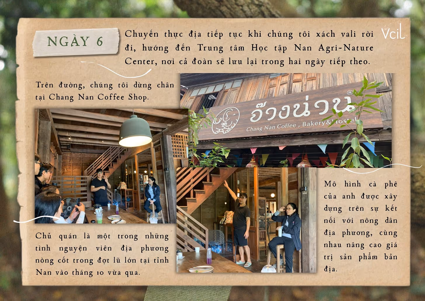 Trên đường, chúng tôi dừng chân tại Chang Nan Coffee Shop. Chủ quán là một trong những tình nguyện viên địa phương nòng cốt trong đợt lũ lớn tại tỉnh Nan vào tháng 10 vừa qua. Khi chúng tôi ghé thăm, dấu vết của trận lũ vẫn còn hiện hữu: lớp bùn bám trên tường, vương trong các chậu cây. Mô hình cà phê của anh được xây dựng trên sự kết nối với nông dân địa phương, cùng nhau nâng cao giá trị sản phẩm bản địa. Gặp gỡ anh, chúng tôi được chứng kiến tình bạn nảy nở trong những lúc khó khăn. Chính trong những mùa lũ ấy, những con người dũng cảm, cùng chí hướng đã tìm thấy nhau, gắn bó đến hôm nay và tiếp tục đồng hành vì những giấc mơ về một tương lai tái tạo cho quê hương.