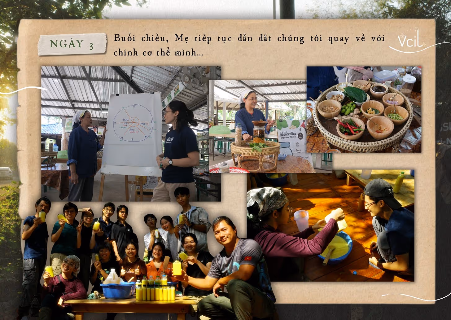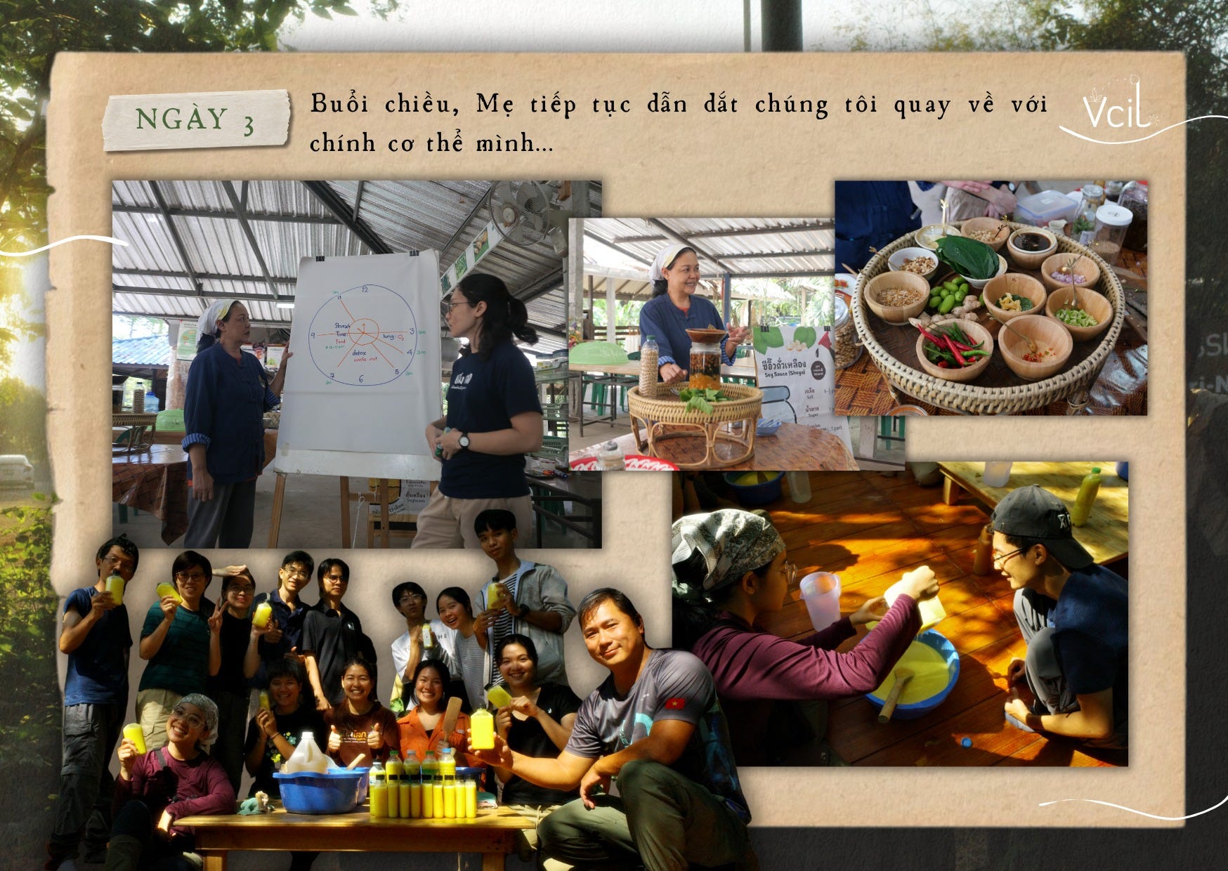 Buổi chiều, mẹ tiếp tục dẫn dắt chúng tôi quay về với chính cơ thể mình. Tại Mab Ueang, việc học y học cổ truyền Thái (Thai Medicine) được xem là một phần quan trọng trong nền tảng của Triết lý Kinh tế Vừa Đủ – bởi khả năng tự chăm sóc sức khỏe cơ bản chính là một biểu hiện của tính tự chủ. Thông qua bài học về đồng hồ sinh học, về các vị tác động lên cơ thể và bốn yếu tố tự nhiên – đất, nước, lửa, khí – mỗi người dần hiểu rõ hơn về thể trạng và nhu cầu riêng của bản thân.