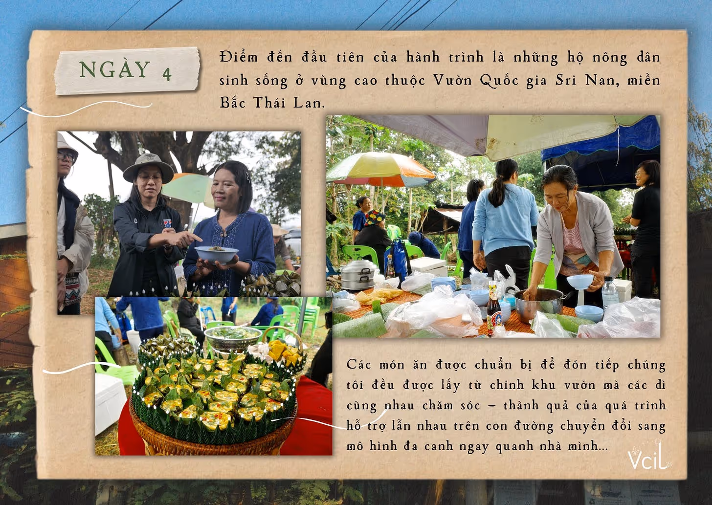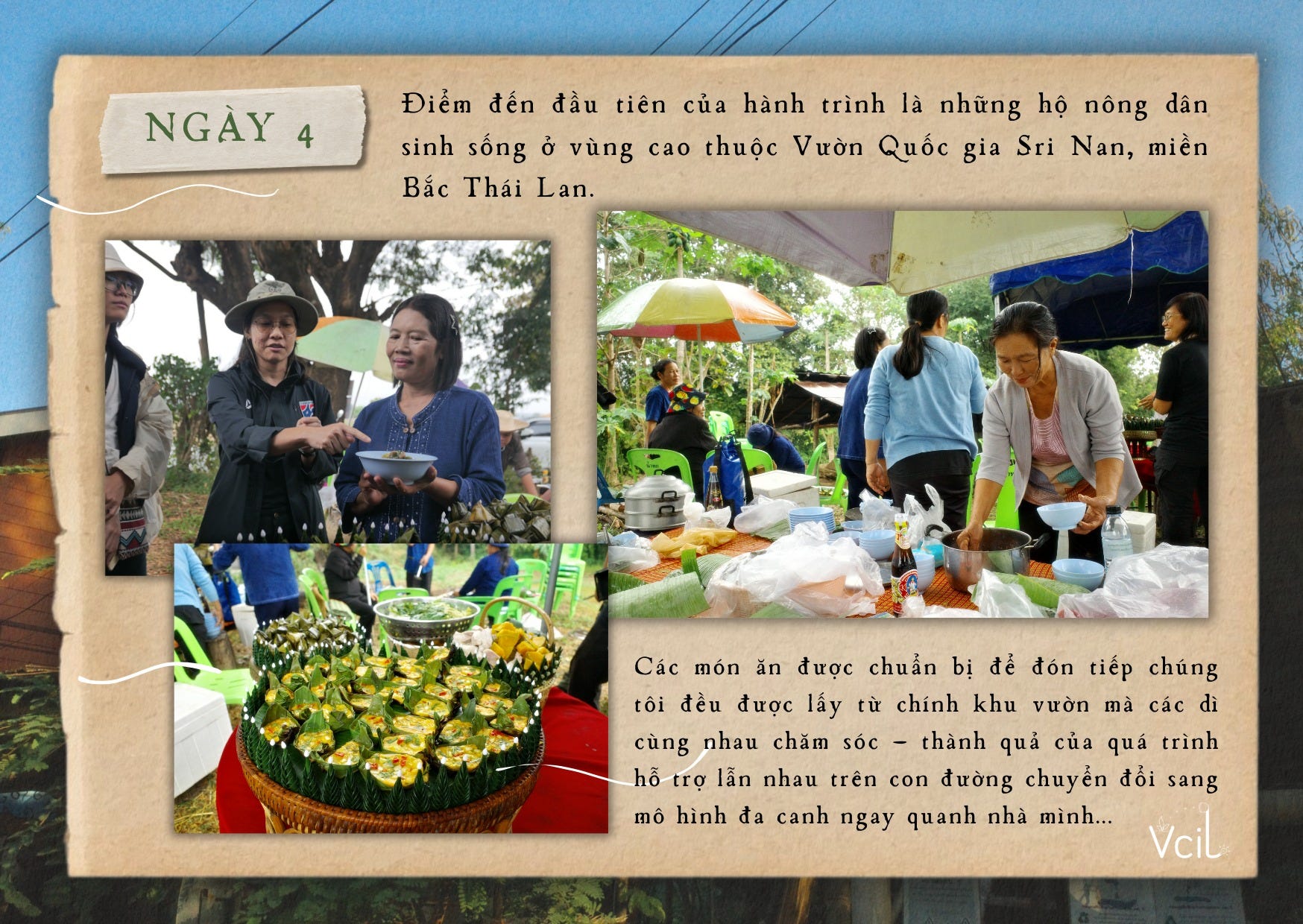 Điểm đến đầu tiên của hành trình là các hộ nông dân sinh sống ở vùng cao thuộc Vườn Quốc gia Sri Nan, miền Bắc Thái Lan. Khi đoàn đến nơi vào buổi trưa, chúng tôi được các “dì” trong xóm đón tiếp bằng một bữa cơm ấm cúng, với phần lớn nguyên liệu được lấy từ chính khu vườn mà họ cùng nhau chăm sóc. Những món ăn giản dị ấy là kết quả của quá trình hỗ trợ lẫn nhau khi người dân từng bước chuyển sang mô hình đa canh quanh nhà, thay cho lối canh tác cũ.