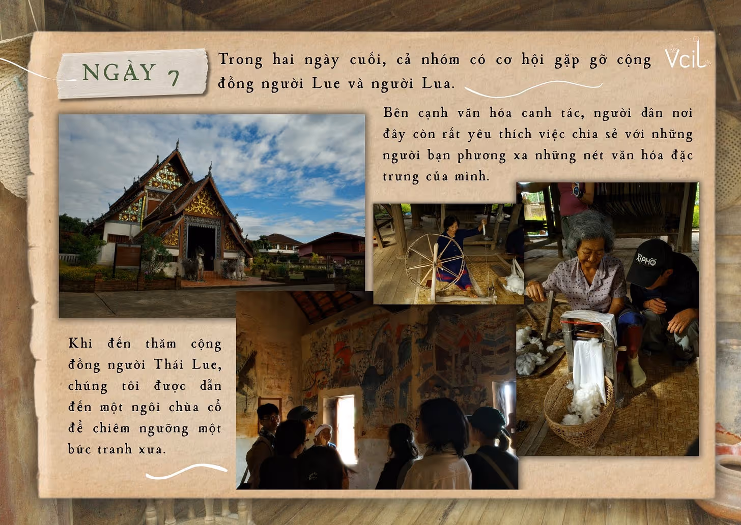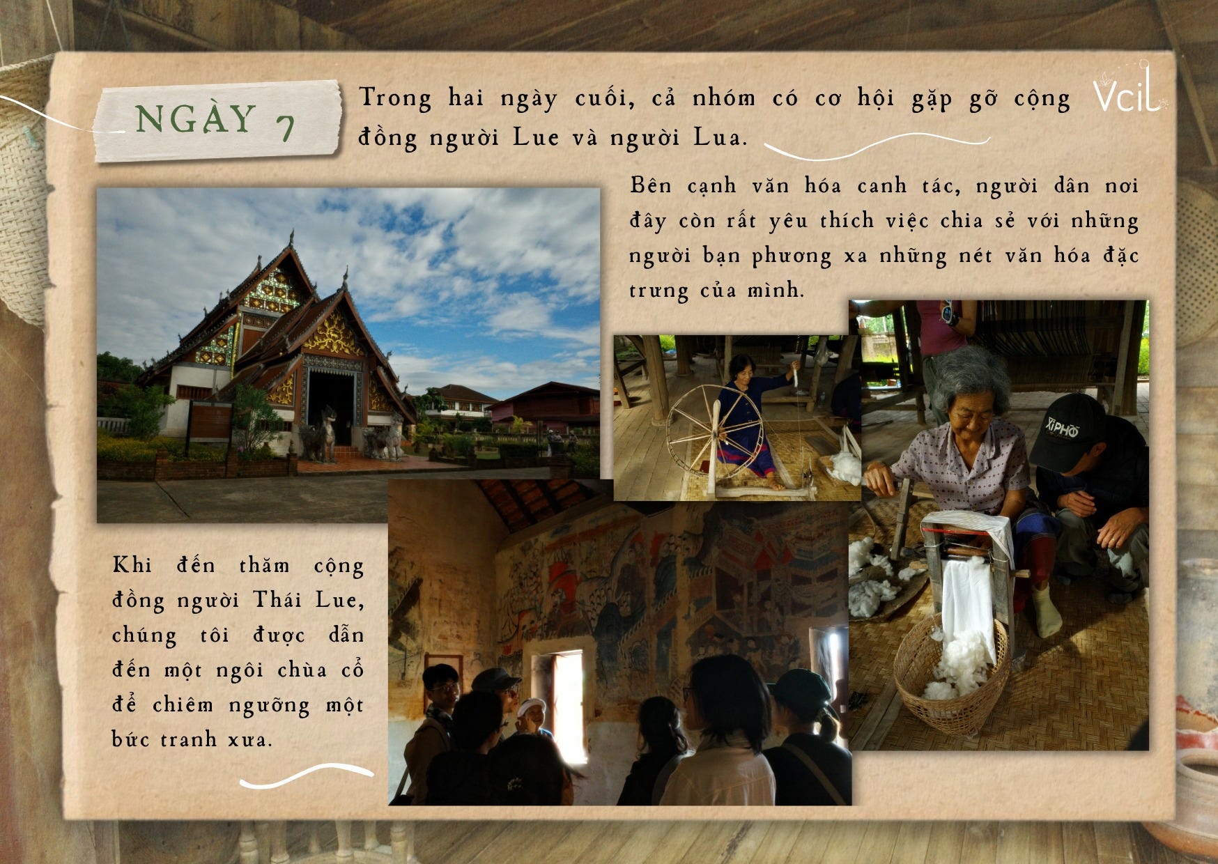 Tại cộng đồng người Thái Lue, chúng tôi được dẫn đến một ngôi chùa cổ để chiêm ngưỡng bức tranh xưa còn lưu dấu. Trận lũ gần đây đã khiến nhiều chi tiết phai mờ, để lại trên bức tranh những vết tích mong manh của thời gian và thiên tai. Ở cộng đồng người Thái Lua, chúng tôi được hướng dẫn tự tay làm những vật may mắn từ tre đan; những người ông trong làng còn cẩn thận cầu nguyện, gửi lời chúc bình an đến từng thành viên trong đoàn.