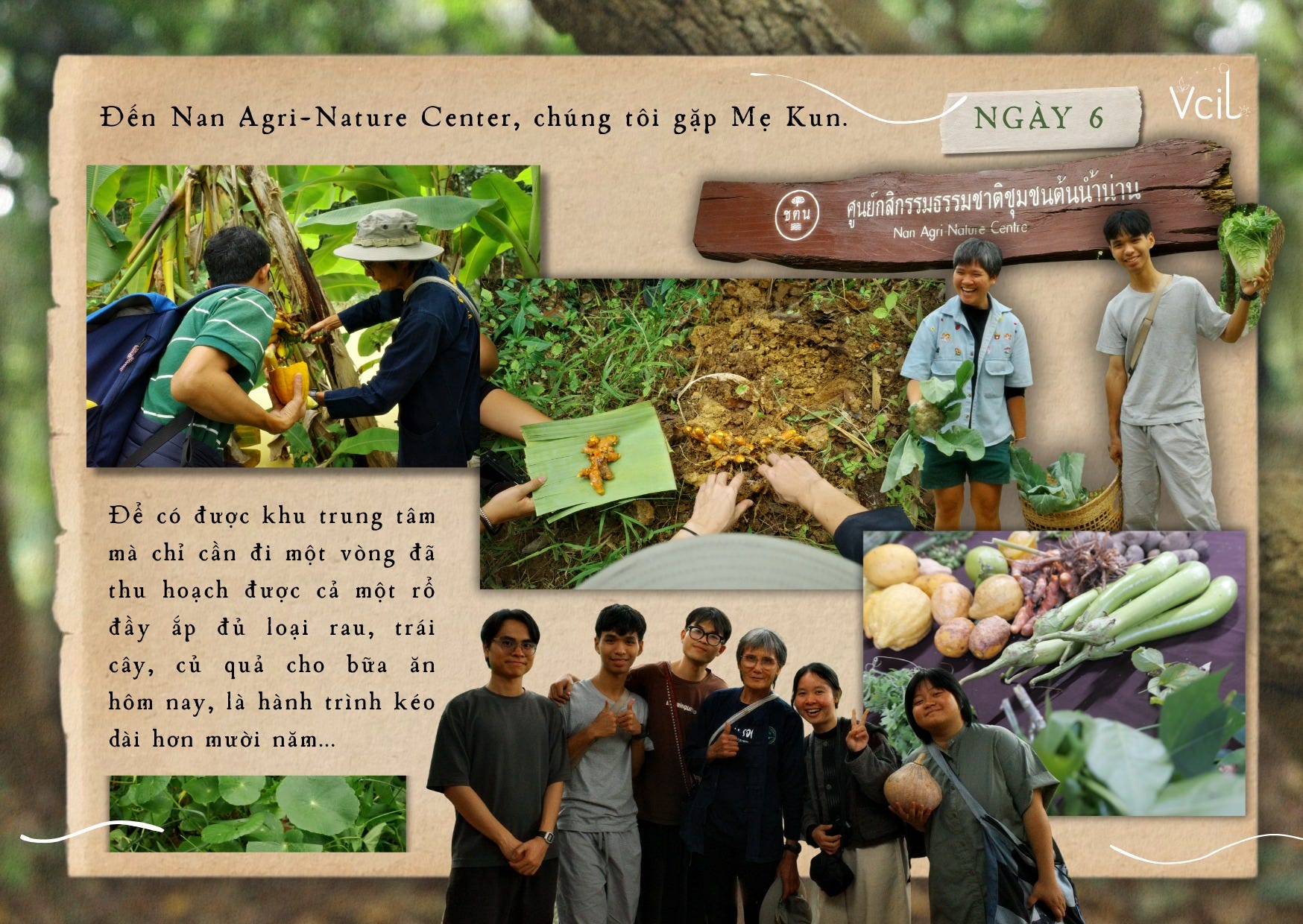 Đến Nan Agri-Nature Center, chúng tôi gặp Mẹ Kun. Để có được khu trung tâm mà chỉ cần đi một vòng đã thu hoạch được cả một rổ đầy ắp đủ loại rau, trái cây, củ quả cho bữa ăn hôm nay, là hành trình kéo dài hơn mười năm. Mẹ cho chúng tôi xem những bức ảnh của năm đầu tiên — ai nấy đều khó tin vào mắt mình. Khi ấy, trên mảnh đất từng bị độc canh cao su dày đặc, hầu như không một loài cây nào có thể mọc lên.
