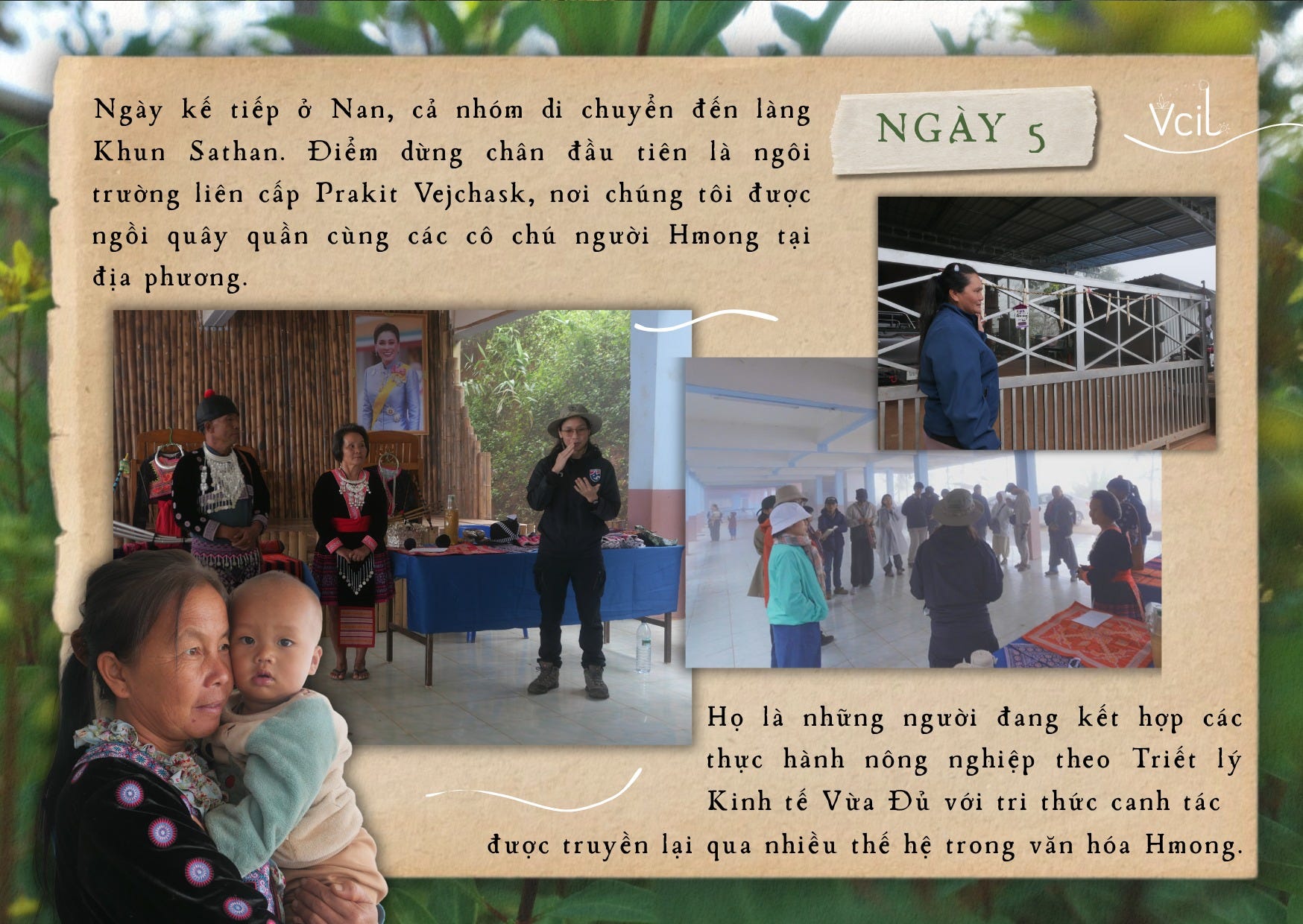 Ngày kế tiếp tại Nan, cả nhóm di chuyển đến làng Khun Sathan. Điểm dừng chân đầu tiên là Trường liên cấp Prakit Vejchask, nơi chúng tôi ngồi quây quản cùng các cô chú người Hmong tại địa phương. Họ chia sẻ về cách kết hợp các thực hành nông nghiệp theo Triết lý Kinh tế Vừa Đủ với tri thức canh tác được truyền lại qua nhiều thế hệ trong văn hóa Hmong. Trong những câu chuyện mộc mạc là nỗi trăn trở khi đất đai dần bạc màu, cùng mong muốn gìn giữ mảnh đất này như một di sản sống cho con cháu mai sau.