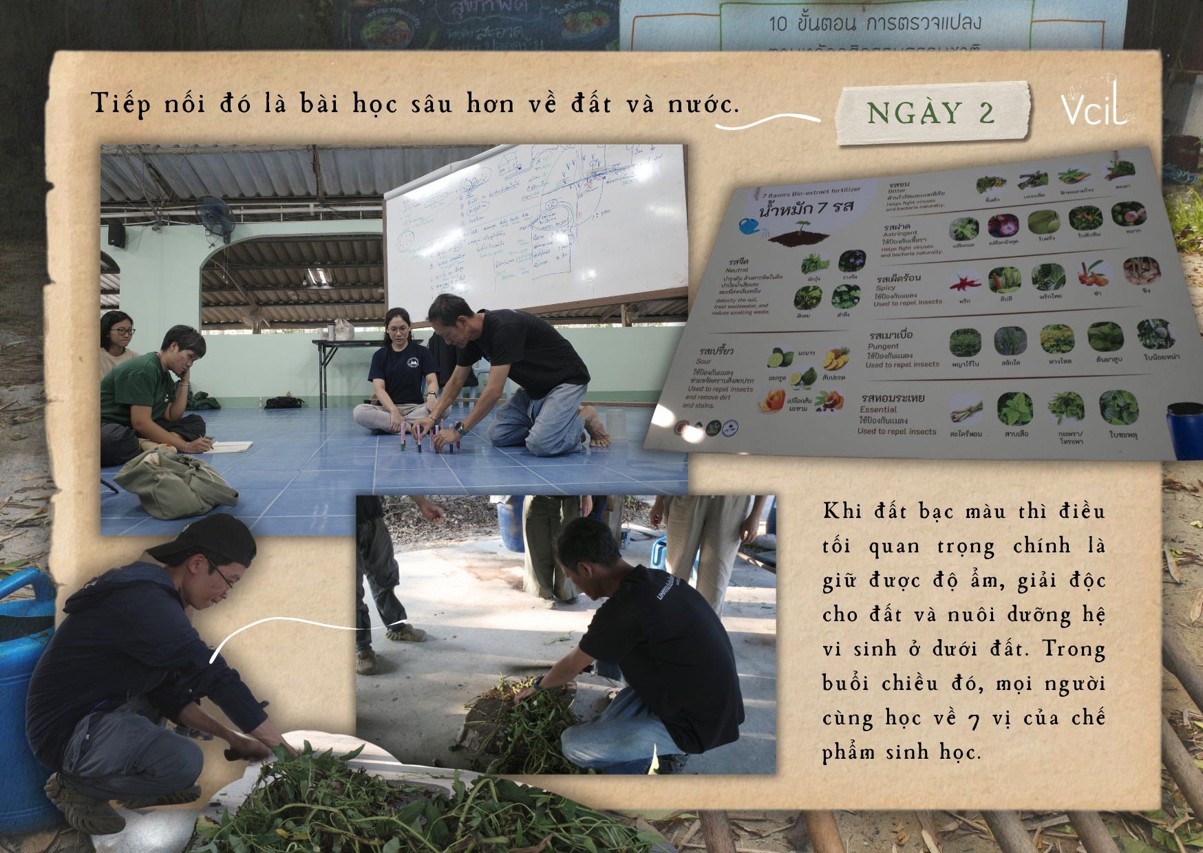 Buổi học tiếp theo đi sâu hơn vào mối quan hệ giữa đất và nước. Khi đất đã bạc màu, điều quan trọng trước hết là giữ được độ ẩm, giải độc cho đất và nuôi dưỡng hệ vi sinh bên dưới bề mặt. Trong buổi chiều, chúng tôi cùng tìm hiểu về 7 vị của chế phẩm sinh học dành cho đất, đồng thời trực tiếp thực hành làm chế phẩm để hiểu rõ hơn cách đất được phục hồi từ bên trong.