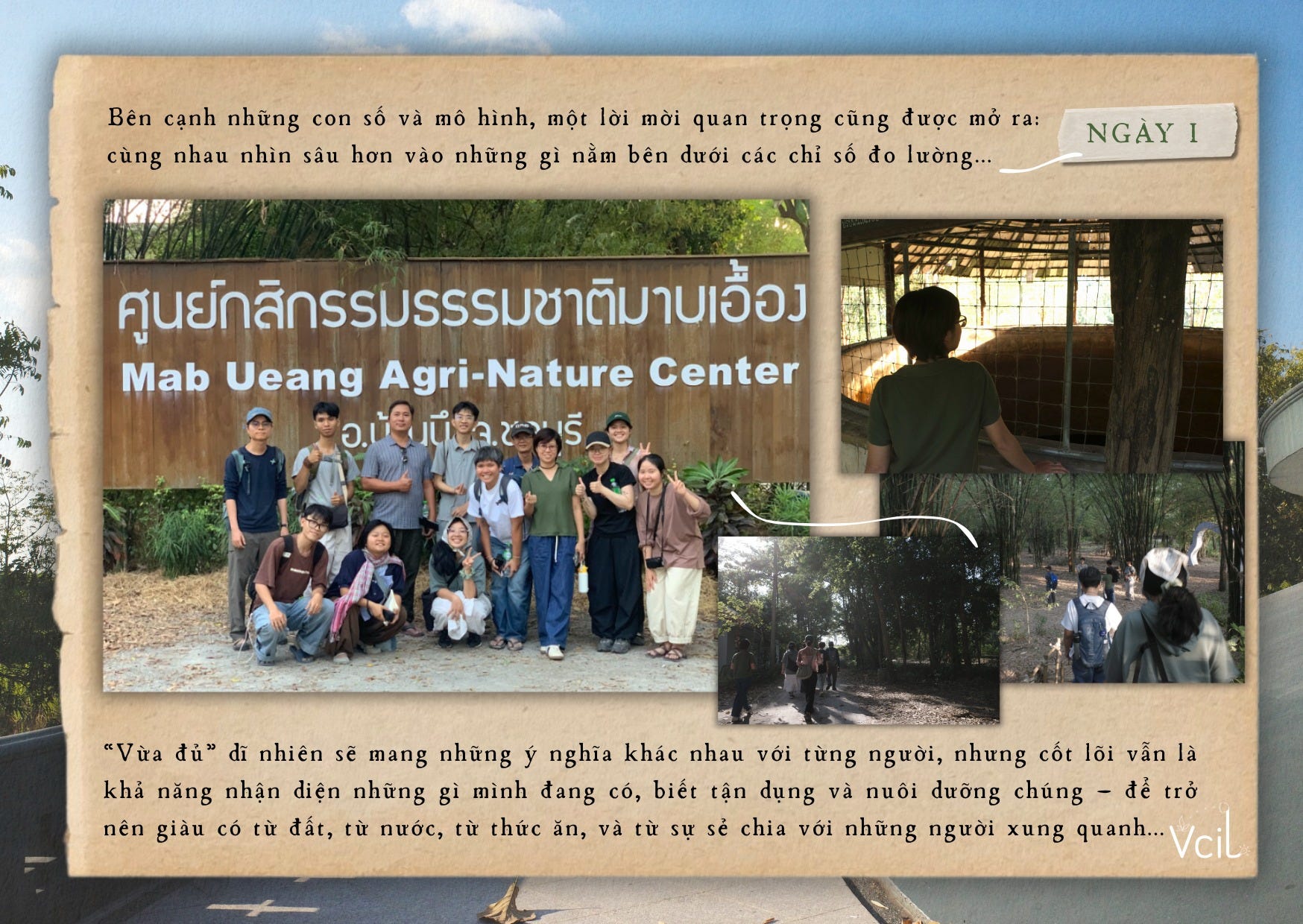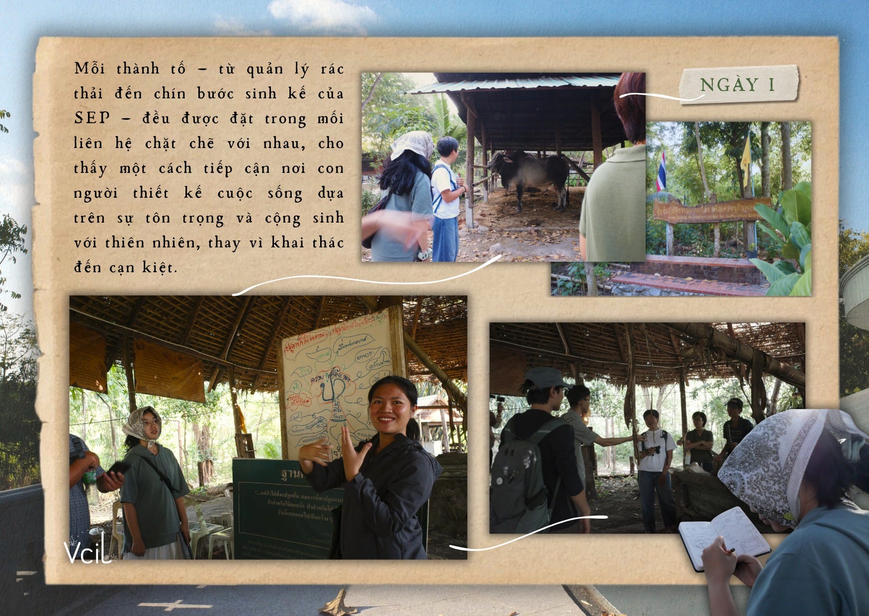 Tại các trạm thực địa, người học có cơ hội tiếp cận cách làm của dự án Nan Reforestation thuộc mạng lưới Agri-Nature. Ở đây, Triết lý Kinh tế Vừa Đủ không được áp dụng như một khuôn mẫu cứng nhắc, mà như một công cụ định hướng. Dự án không bắt đầu bằng việc đưa ra giải pháp sẵn có, mà bằng quá trình lắng nghe: điều gì là nhu cầu thực sự của người dân, đâu là giới hạn sinh thái, và nguồn lực nào đang hiện hữu trong cộng đồng. Từ đó, các nguyên lý của SEP – vừa phải, hợp lý và khả năng tự miễn dịch – được vận dụng linh hoạt, phù hợp với từng bối cảnh cụ thể.