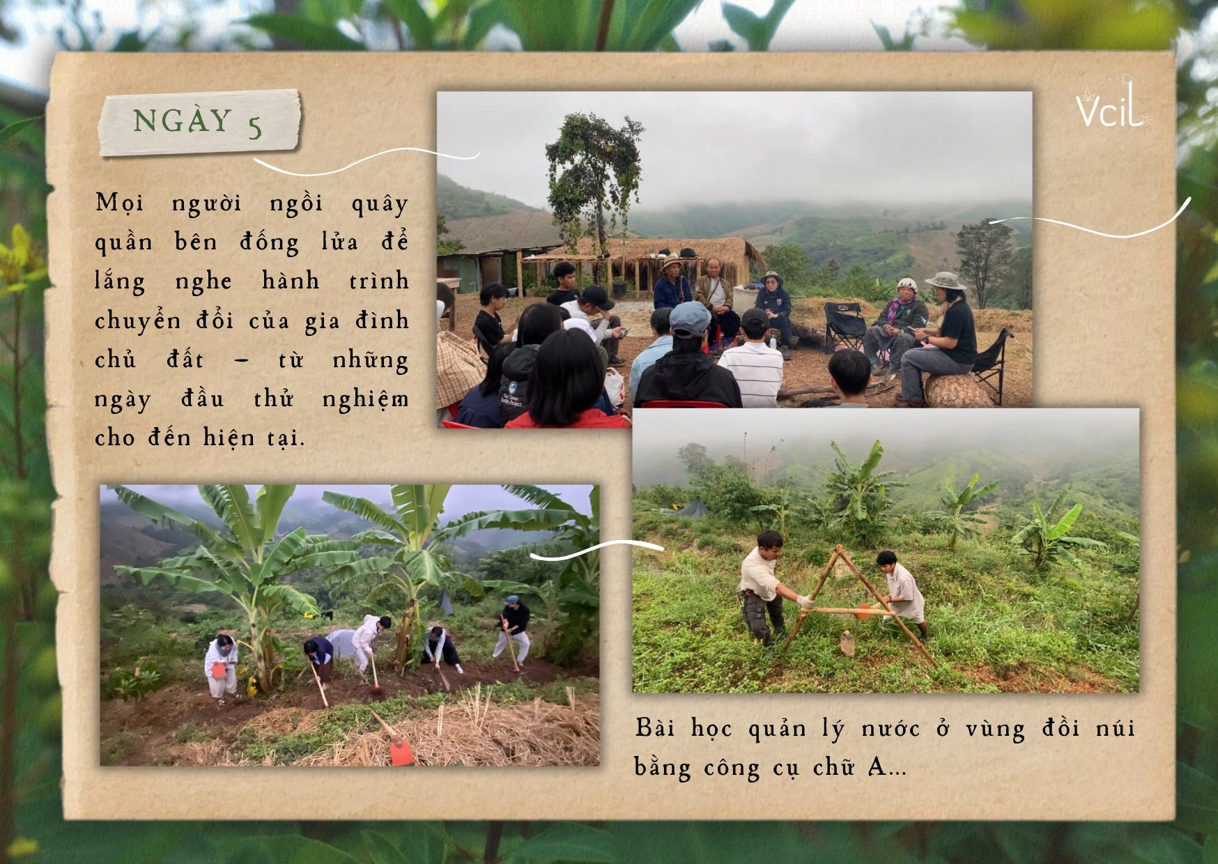 Giữa khung cảnh núi đồi, cả nhóm ngồi lại để lắng nghe hành trình chuyển đổi của gia đình chủ đất – từ những thử nghiệm ban đầu đến các thực hành đang dần ổn định. Tại đây, một bài học quan trọng về quản lý nước trên địa hình đồi núi được mở ra. Công cụ chữ A, được làm đơn giản từ tre, giúp xác định các đường đồng mức để đào mương và giữ nước mưa thấm dần vào đất, thay vì chảy trôi xuống chân đồi.