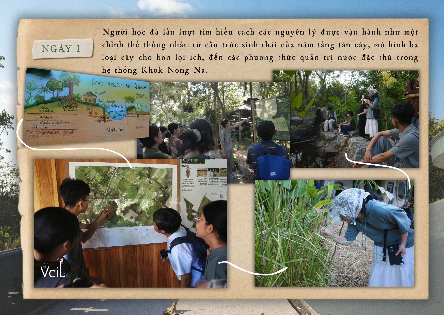Người học đã lần lượt tìm hiểu cách các nguyên lý được vận hành như một chỉnh thể thống nhất: từ cấu trúc sinh thái của năm tầng tán cây, mô hình ba loại cây cho bốn lợi ích, đến các phương thức quản trị nước đặc thù trong hệ thống Khok Nong Na.