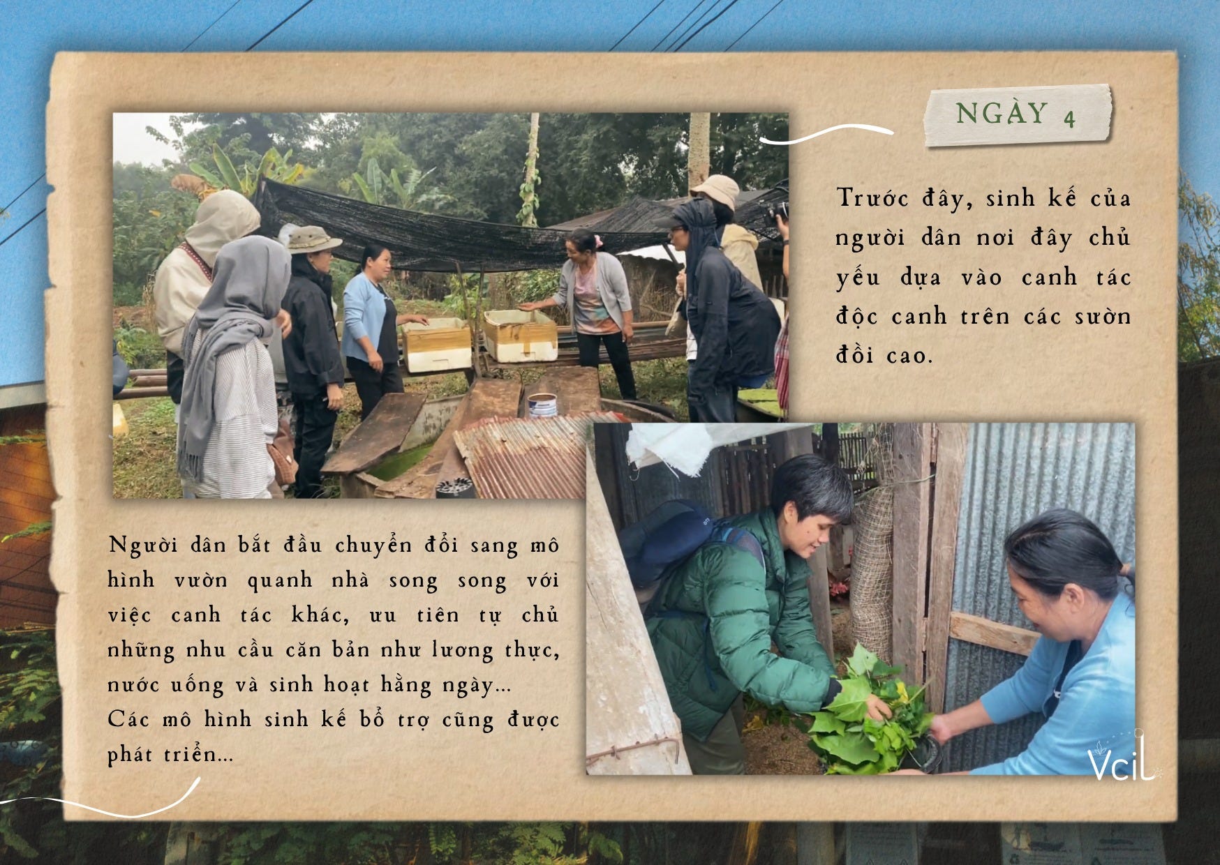 Rời trường học, chiếc xe bán tải chở người học phía sau ngăn thùng hàng vượt dốc, đưa cả nhóm lên đỉnh một ngọn đồi gần đó. Nơi đây là mảnh đất của một hộ dân đang đồng hành cùng mạng lưới Agri-Nature để xây dựng một khu đất mẫu — vừa là không gian thực hành, vừa là điểm gặp gỡ và trao đổi học tập quy mô nhỏ của các cô chú trong làng.
