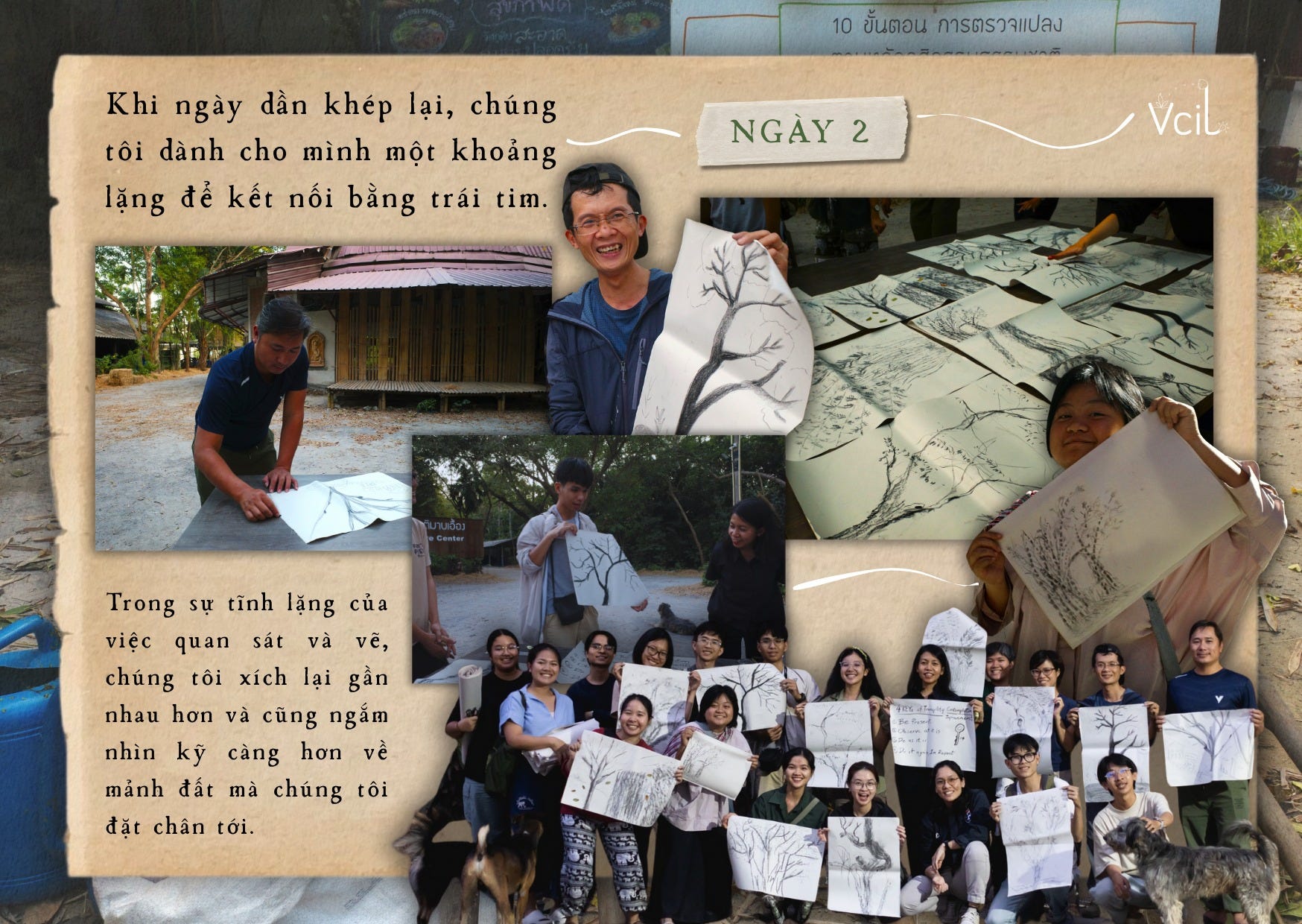 Khi ngày học dần khép lại, cả nhóm dành cho mình một khoảng lặng để kết nối bằng trái tim. Việc ngồi lại, quan sát cây cỏ và phác họa chúng bằng những mẩu than tre thô mộc dường như xóa nhòa khoảng cách giữa những con người chỉ mới gặp nhau. Trong sự tĩnh lặng của việc quan sát và vẽ, chúng tôi không chỉ xích lại gần nhau hơn, mà còn học cách nhìn kỹ và chậm hơn mảnh đất đang hiện diện trước mắt mình.