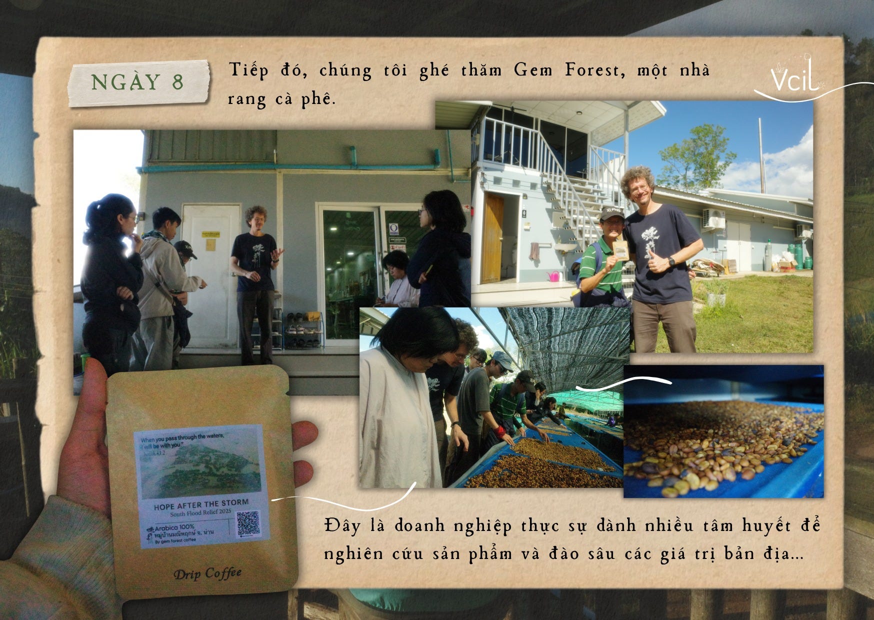 Ngày cuối cùng của hành trình là ngày của “cà phê”. Sau khi nghỉ ngơi tại một ngôi làng trồng và chế biến cà phê, chúng tôi có cơ hội gặp gỡ trực tiếp và trò chuyện với chủ thương hiệu Coffee De Hmong cùng những người nông dân đã chăm sóc nên những cây cà phê ấy. Họ dẫn chúng tôi băng lên tán rừng, nơi cà phê được trồng dưới chân những cây gỗ lớn – một mô hình canh tác hài hòa với rừng, đặt sự bền vững của hệ sinh thái lên trước năng suất ngắn hạn.