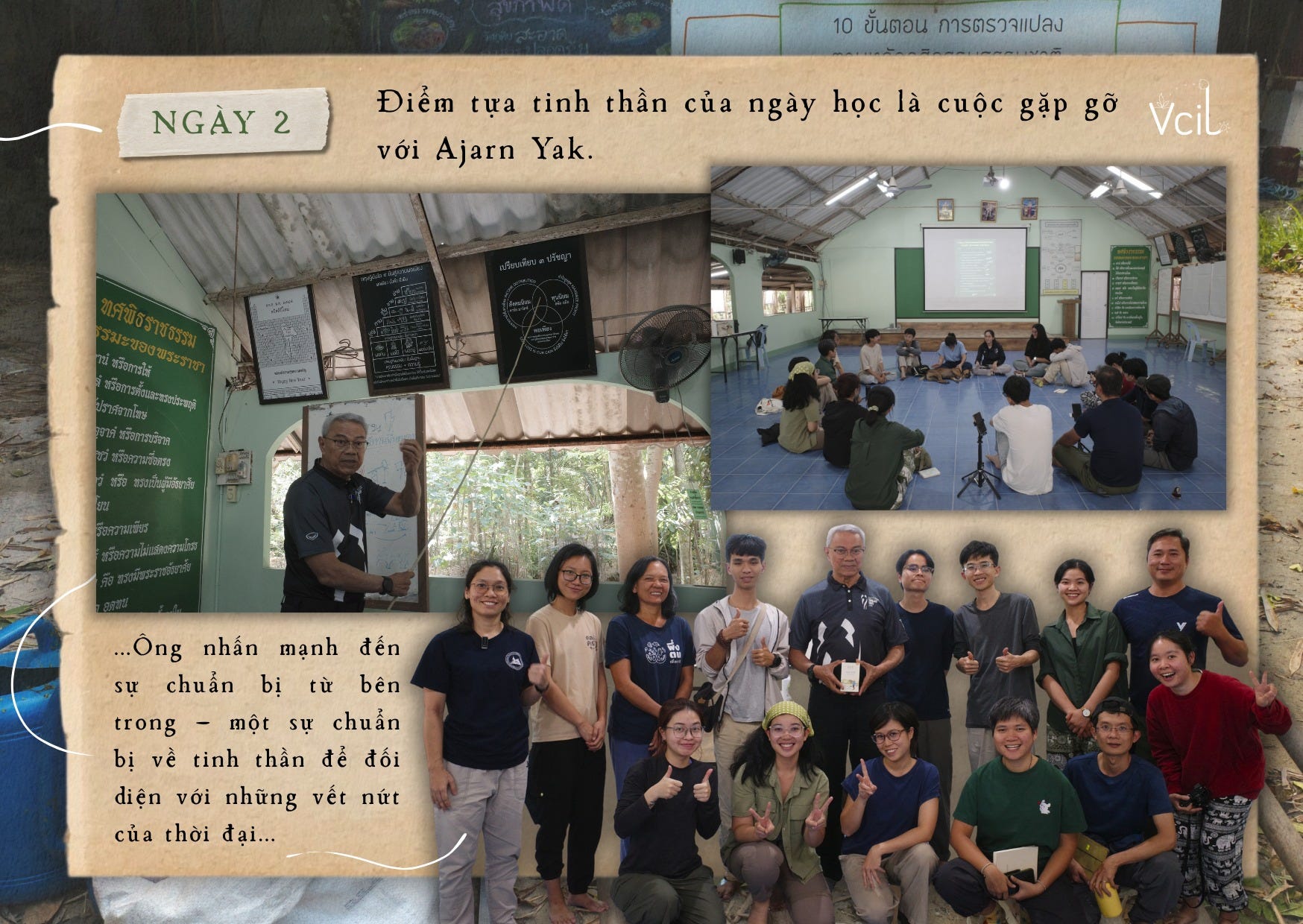 Điểm tựa tinh thần của ngày học là cuộc gặp gỡ với Ajarn Yak. Từ chính những thăng trầm trong cuộc đời mình, ông mở ra một cuộc đối thoại về tâm thế cần có trước những biến động và khủng hoảng trong tương lai. Ông chia sẻ lý do mạng lưới kiên trì xây dựng và thử nghiệm các mô hình giữ đất, giữ nước tại nhiều địa phương khác nhau, như những “bản mẫu sống” để cộng đồng có thể quan sát và học hỏi. Theo ông, mọi sự chuyển hóa bền vững đều cần bắt đầu từ sự chuẩn bị bên trong – một nền tảng tinh thần đủ vững để đối diện với những “vết nứt” của thời đại.