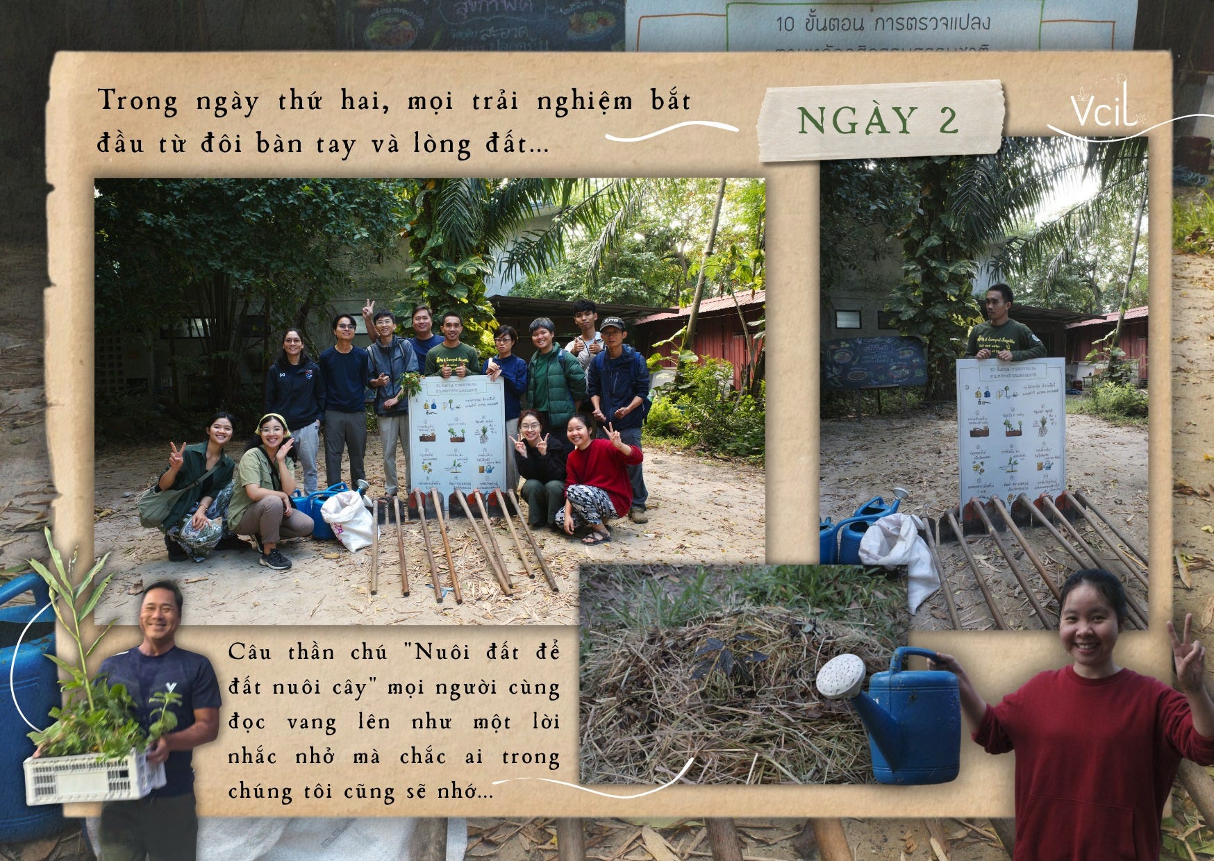 Ngày học thứ hai bắt đầu từ những trải nghiệm rất cụ thể với đôi bàn tay và lòng đất. Tại Mab Ueang, chúng tôi trực tiếp cầm cuốc để thực hành bài học về quy trình 10 bước trồng cây. Sự hiểu biết được bồi đắp dần qua việc quan sát cấu trúc năm tầng tán của hệ sinh thái và thực hành trồng ba loại cây cho bốn lợi ích. Bên cạnh đó, cả nhóm cùng trồng cỏ Vetiver nhằm giữ mạch nước, che phủ đất bằng rơm, đồng thời tưới chế phẩm sinh học và phân bón hữu cơ để khởi động quá trình “giải độc” cho đất. Câu thần chú “Nuôi đất để đất nuôi cây” được mọi người cùng đọc vang lên, như một lời ghi nhớ giản dị nhưng sâu sắc cho suốt hành trình học tập.