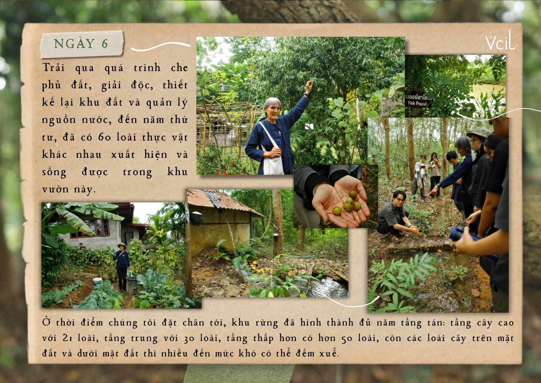“Nuôi đất, để đất nuôi cây” — chúng tôi thầm nghĩ, và hiểu vì sao điều đó lại quan trọng đến vậy. Trải qua quá trình che phủ đất, giải độc, thiết kế lại khu đất và quản lý nguồn nước, đến năm thứ tư, đã có 60 loài thực vật khác nhau xuất hiện và sống được trong khu vườn này. Ở thời điểm chúng tôi đặt chân tới, khu rừng đã hình thành đủ năm tầng tán: tầng cây cao với 21 loài, tầng trung với 30 loài, tầng thấp hơn có hơn 50 loài, còn các loài cây trên mặt đất và dưới mặt đất thì nhiều đến mức khó có thể đếm xuể.