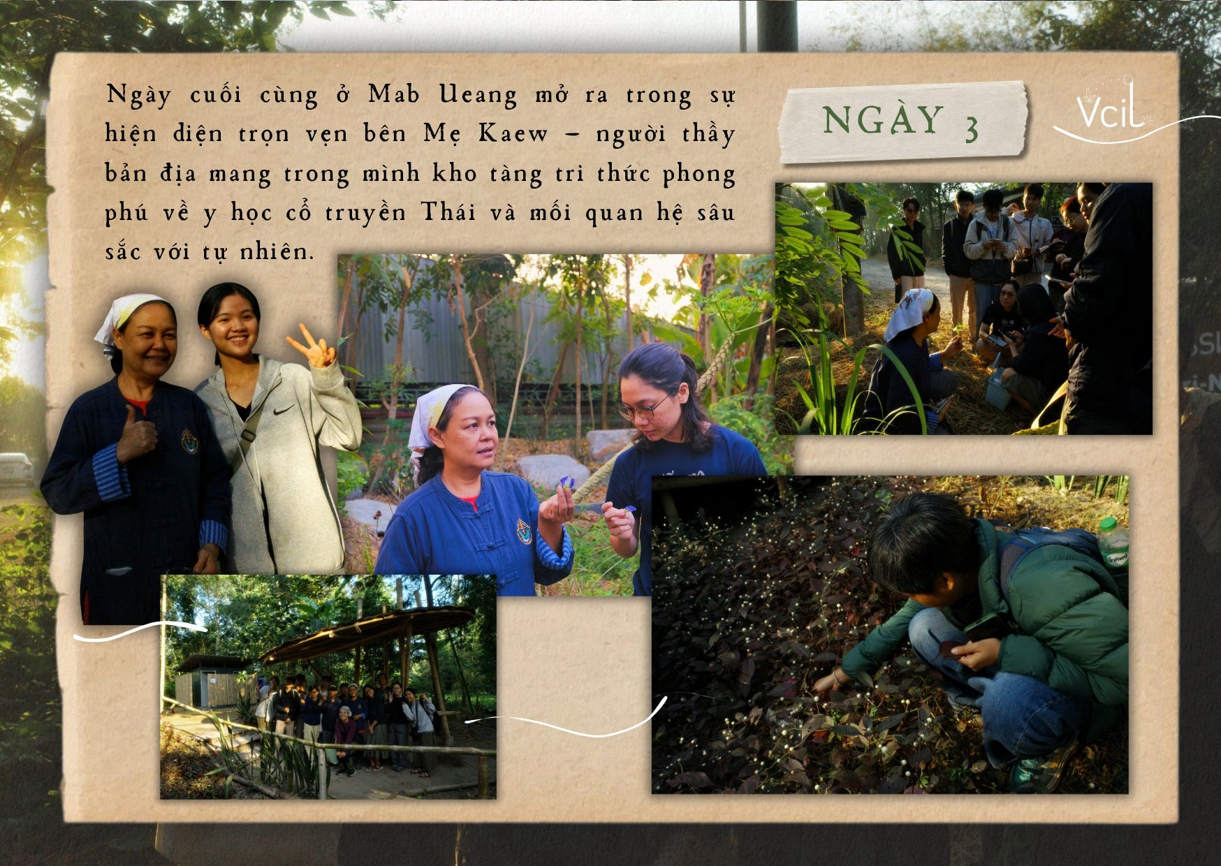 Ngày cuối cùng tại Mab Ueang mở ra trong sự hiện diện trọn vẹn bên mẹ Kaew – người thầy bản địa mang trong mình kho tàng tri thức phong phú về y học cổ truyền Thái và mối quan hệ sâu sắc với tự nhiên. Chúng tôi gọi bà là “mẹ” như một cách để nuôi dưỡng sự gần gũi và tôn trọng. Khi sáng còn tinh mơ, mẹ dẫn cả nhóm đi một vòng quanh Mab Ueang, nhưng qua một lăng kính hoàn toàn khác: không còn là cảnh quan quen thuộc, mà là thế giới của cây cỏ, nơi mỗi loài hiện ra với tên gọi, công dụng và câu chuyện riêng.