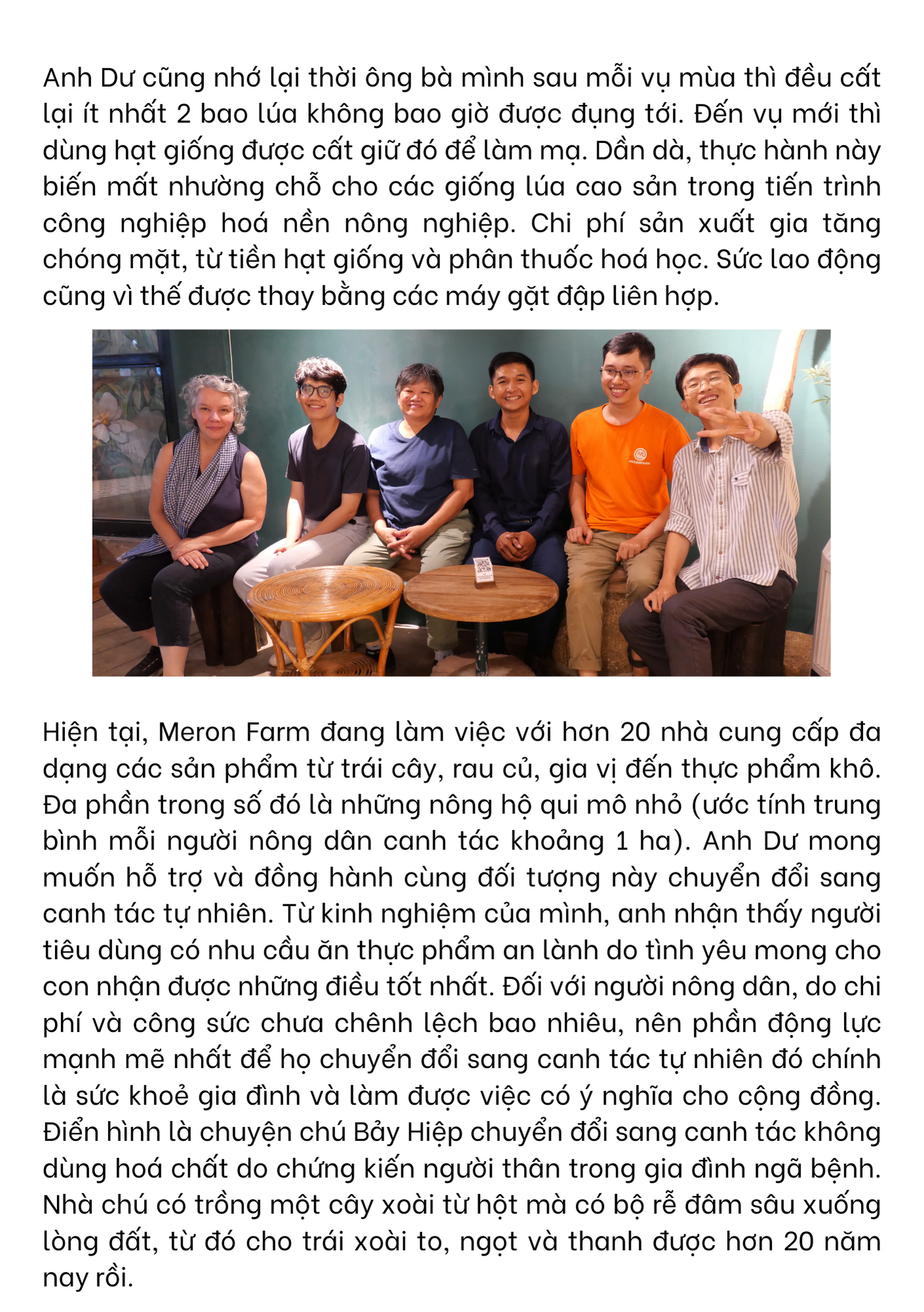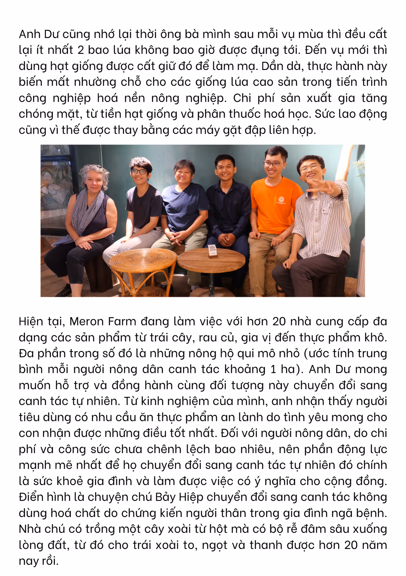 Chú nhận định các giống lúa cao sản “cải tiến" phụ thuộc rất lớn vào phân bón hoá học và thuốc bảo vệ thực vật. Và khi đất bị kiệt quệ và nguồn nước bị ô nhiễm, năng suất đạt tới giới hạn trần thì chúng ta cần một hướng đi mới. Xung quanh chỗ chú sống, nhiều người nông dân có diện tích đất nhỏ không thể bám trụ với nghề (do chi phí sản xuất lên cao mà thành phẩm bán ra không nhiều lợi nhuận) nên đã bán đất đi làm công nhân ở Bình Dương hết rồi. Chú bảo cách làm tối đa hoá lợi nhuận vậy tức là chúng ta đang “ăn vào" phần của con cháu.