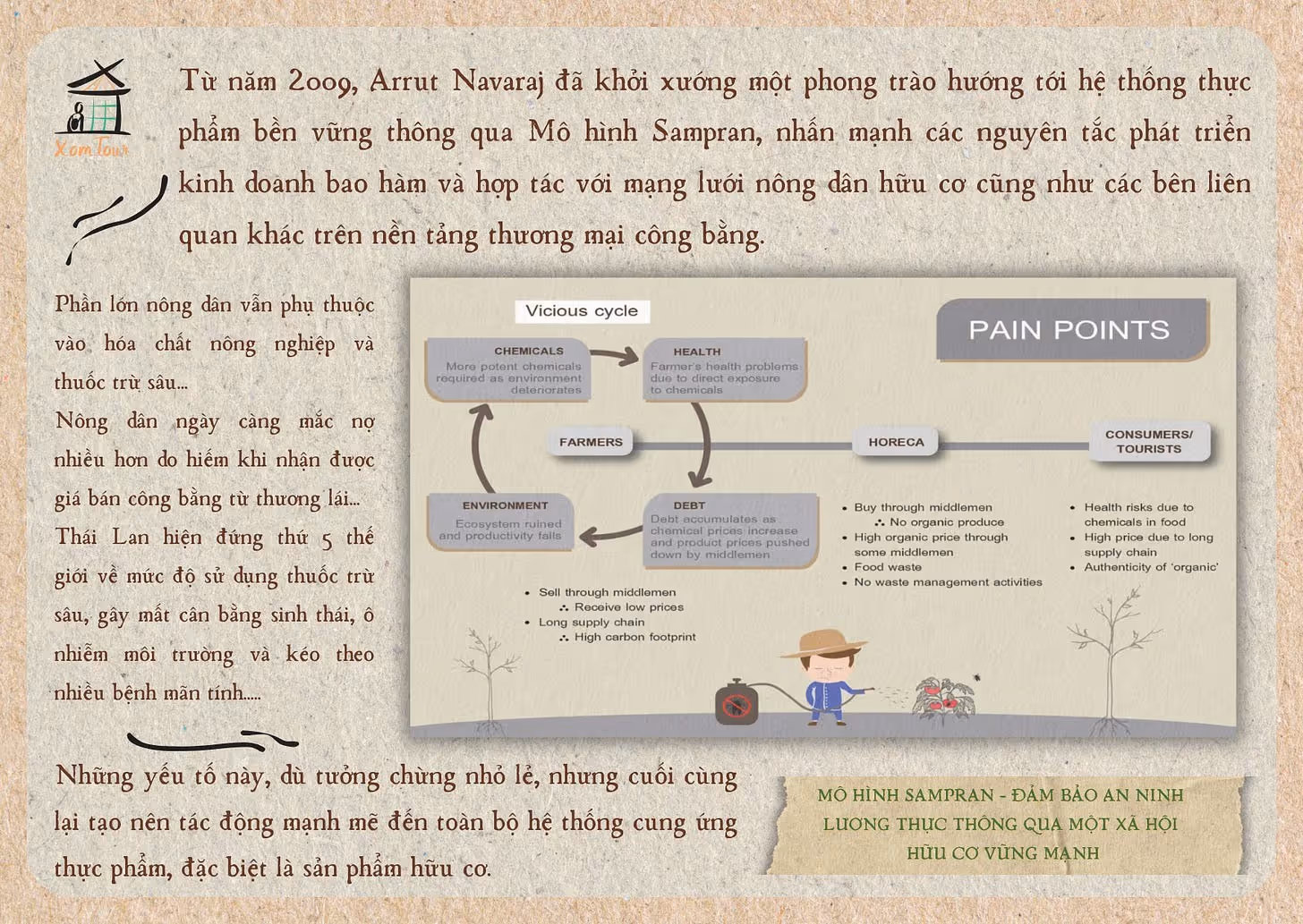 Phần lớn nông dân vẫn phụ thuộc vào hóa chất nông nghiệp và thuốc trừ sâu. Thái Lan hiện đứng thứ 5 thế giới về mức độ sử dụng thuốc trừ sâu, gây mất cân bằng sinh thái, ô nhiễm môi trường và kéo theo nhiều bệnh mãn tính. Việc lạm dụng thuốc trừ sâu còn ảnh hưởng đến toàn bộ chuỗi cung ứng thực phẩm, từ nông dân, doanh nghiệp, người tiêu dùng đến cả quốc gia.