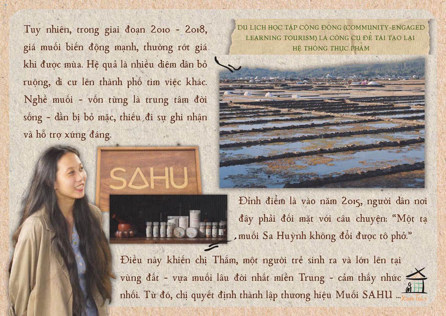Đỉnh điểm là vào năm 2015, người dân nơi đây phải đối mặt với câu chuyện: “Một tạ muối Sa Huỳnh không đổi được tô phở.” Điều này khiến chị Thắm, một người trẻ sinh ra và lớn lên tại vùng đất – vựa muối lâu đời nhất miền Trung – cảm thấy nhức nhối. Dù gia đình không làm muối, chị vẫn dành tình yêu đặc biệt cho món quà từ biển cả này. Từ đó, chị quyết định thành lập thương hiệu Muối SAHU, với sứ mệnh cải thiện đời sống diêm dân bằng cách thu mua muối với mức giá công bằng, phản ánh đúng chất lượng và công sức lao động. Bằng việc nâng cao giá trị muối ngay tại nguồn, chị mong muốn giúp diêm dân có được sinh kế bền vững để tiếp tục gắn bó với nghề truyền thống.