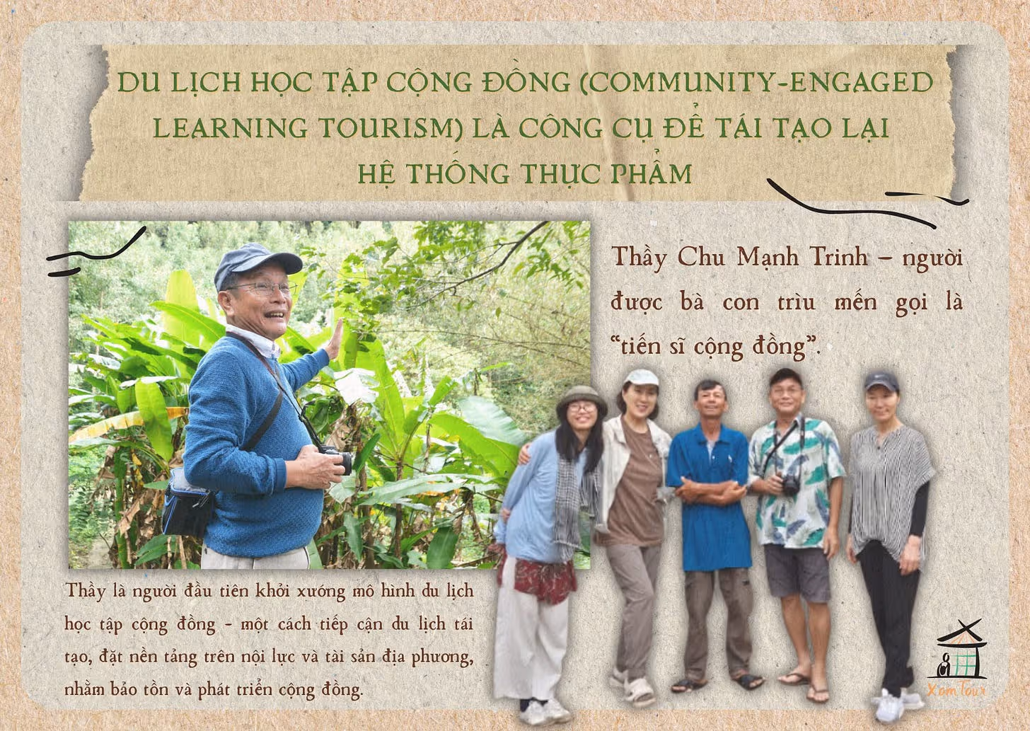 Rời Thái Lan, chúng tôi bay về Đà Nẵng, Việt Nam để tiếp tục chuyến đi này. Đồng hành cùng chúng tôi trong chuyến đi lần này là thầy Chu Mạnh Trinh — người được bà con trìu mến gọi là “tiến sĩ cộng đồng”. Thầy là người đầu tiên khởi xướng mô hình du lịch học tập cộng đồng – một cách tiếp cận du lịch tái tạo, đặt nền tảng trên nội lực và tài sản địa phương, nhằm bảo tồn và phát triển cộng đồng.