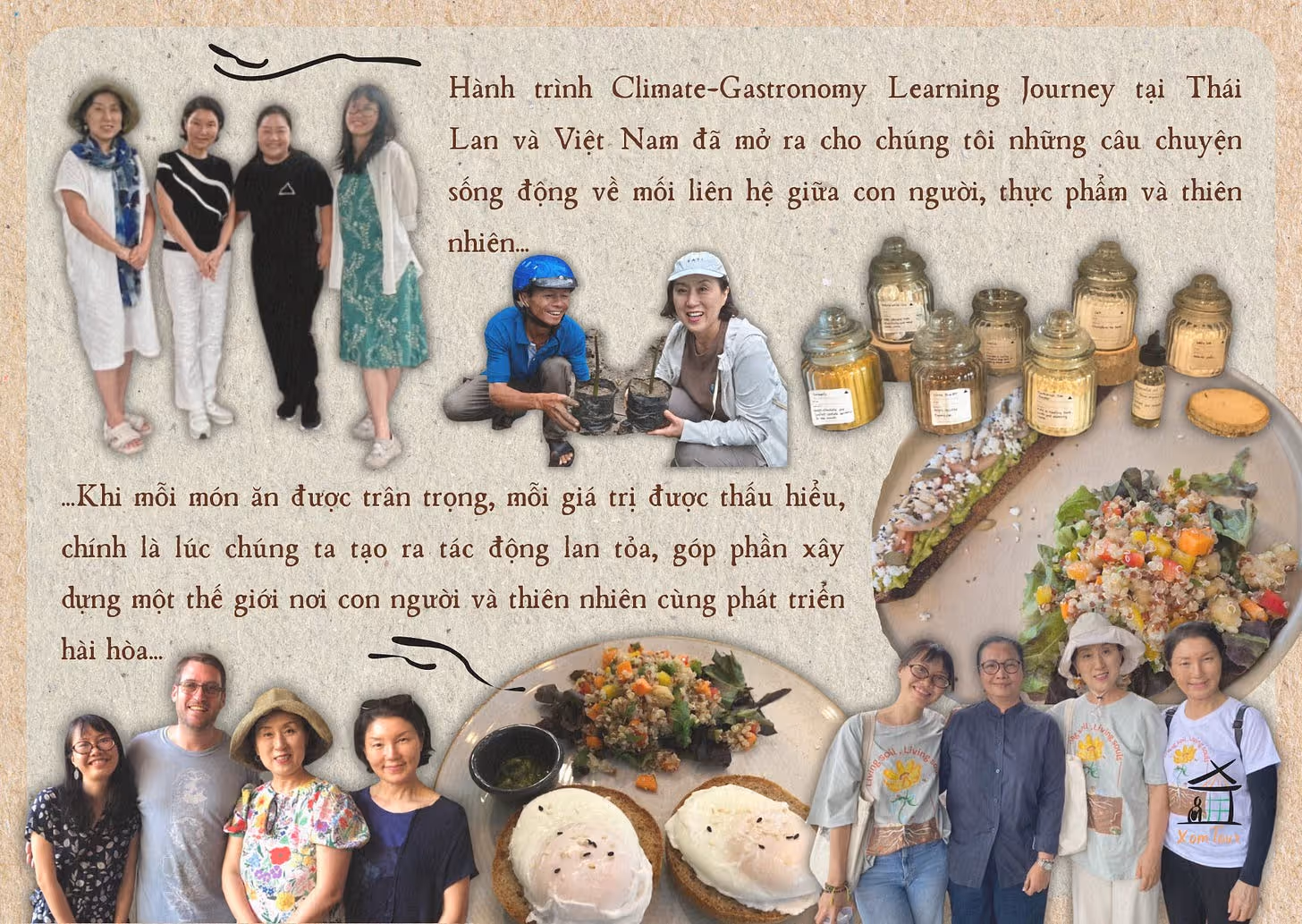 Hành trình Climate-Gastronomy Learning Journey tại Thái Lan và Việt Nam đã mở ra cho chúng tôi những câu chuyện sống động về mối liên hệ giữa con người, thực phẩm và thiên nhiên. Từ cộng đồng Phật giáo Asoke, nhà hàng Bo.lan, mô hình Sampran đến Hợp tác xã du lịch học tập cộng đồng tại Sa Huỳnh, mỗi trải nghiệm đều nhắc nhở rằng thực phẩm không chỉ nuôi dưỡng cơ thể, mà còn kết nối tinh thần, văn hóa và cộng đồng.
