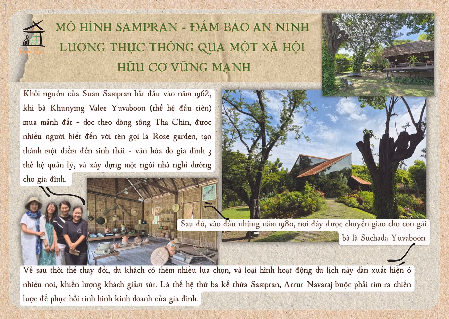 Nằm trên khu đất dọc theo dòng sông Tha Chin, được nhiều người biết đến với tên gọi là Rose garden (tạm dịch: Khu vườn hoa hồng) là một điểm đến sinh thái - văn hóa do gia đình 3 thế hệ quản lý. Khởi nguồn của Suan Sampran bắt đầu vào năm 1962, khi bà Khunying Valee Yuvaboon (thế hệ đầu tiên) mua mảnh đất này và xây dựng một ngôi nhà nghỉ dưỡng cho gia đình. Doanh nghiệp này được thành lập để chào đón những ai muốn rời xa thành phố, tận hưởng vẻ đẹp yên bình của thiên nhiên ven sông và tìm hiểu về lối sống truyền thống Thái Lan. Sau đó, vào đầu những năm 1980, nơi đây được chuyển giao cho con gái bà là Suchada Yuvaboon, người đã biến nó thành một khu vườn hoa hồng - "rose garden", cái tên mà người ta quen thuộc cho đến nay.